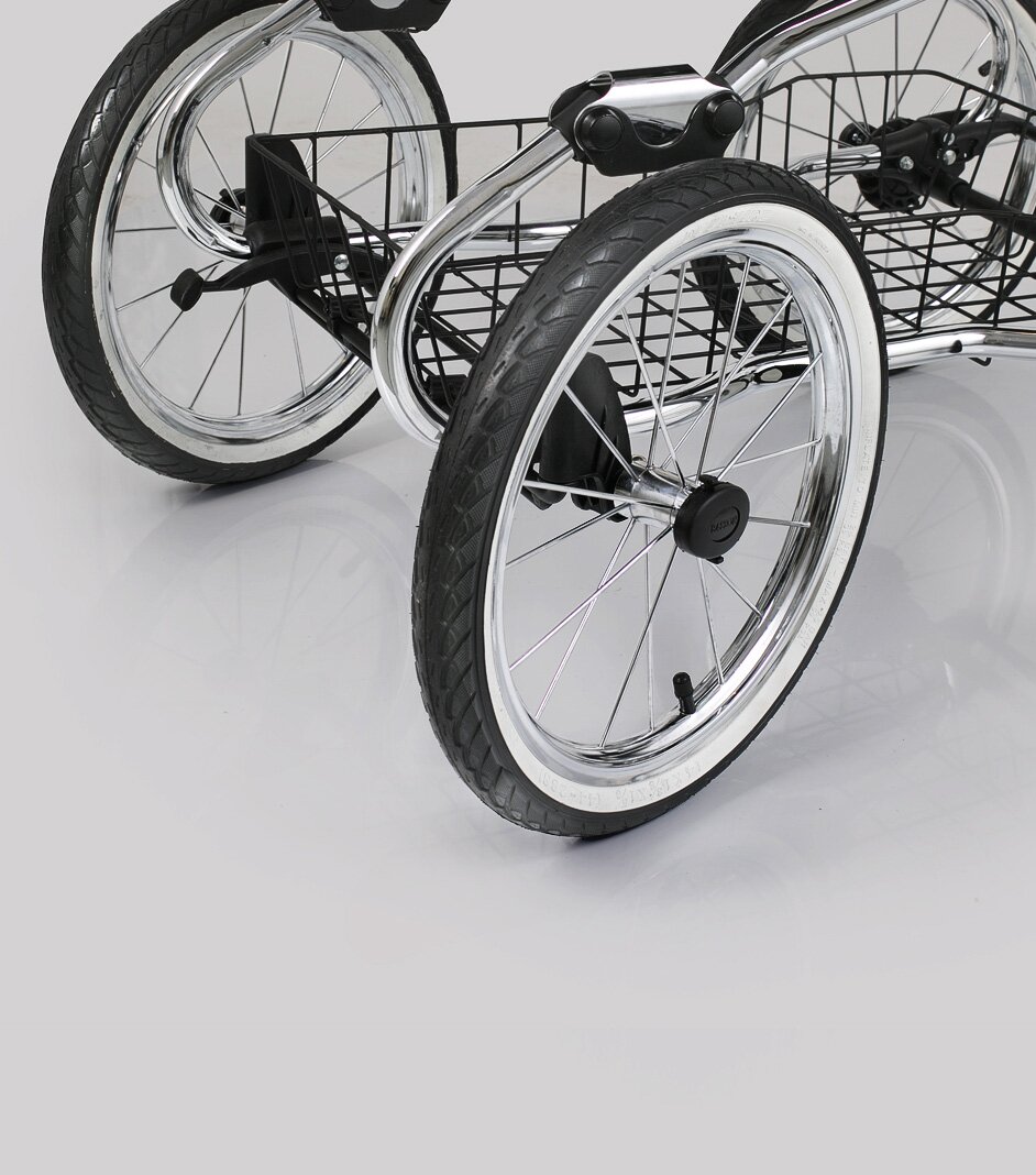 Передние колеса с подруливающим механизмом на 30 градусов. Такой вариант колес дает большую маневренность и удобство в управлении. При необходимости данный механизм блокируется.