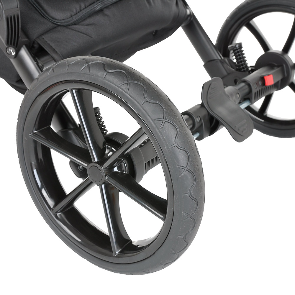 У коляски современная рама из облегченного алюминия с компактным сложением книжкой. Регулируемая амортизация на колесах и раме позволит настроить ход коляски в зависимости от дороги и веса ребенка. На ваш выбор коляска может быть укомплектована гелевыми или надувными колесами. Ручка регулируется в большом диапазоне по высоте, позволяя даже старшему ребенку с легкостью управлять коляской. Центральный тормоз педалькой не портит обувь и удобен в эксплуатации.