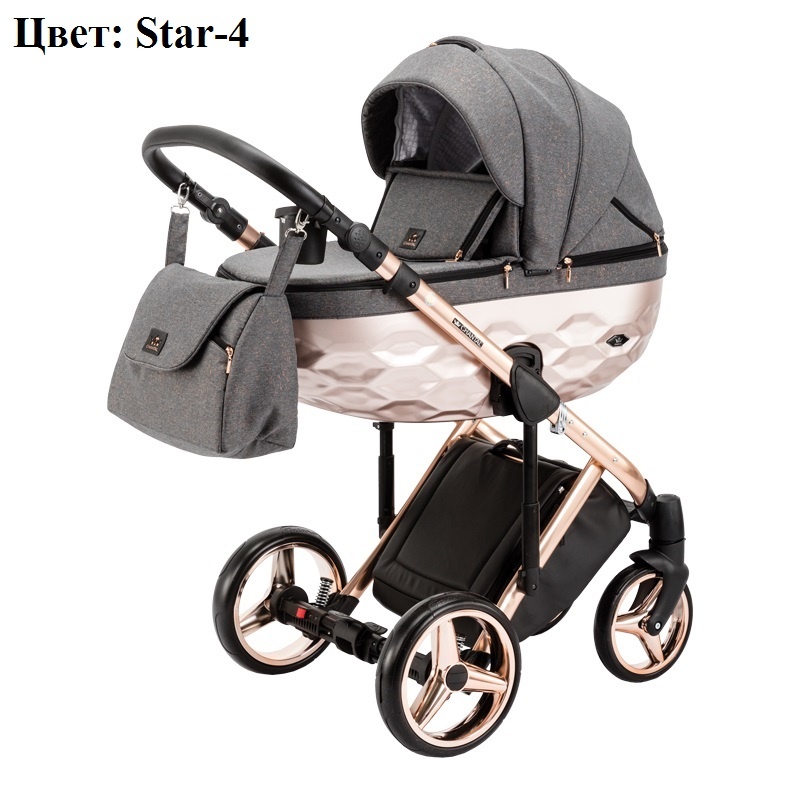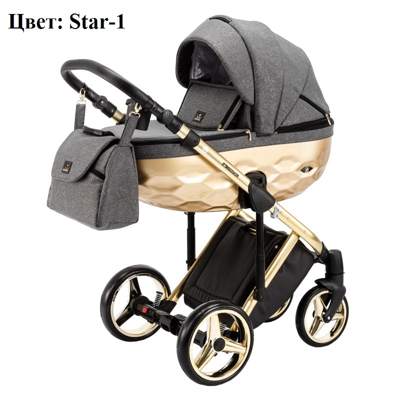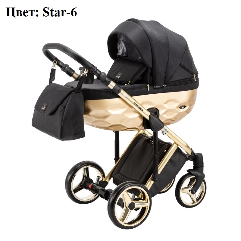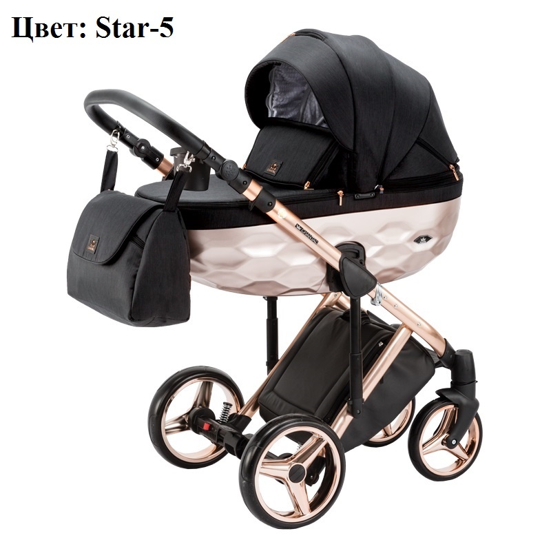 Коляска Adamex Chantal Star Collection 2 в 1 представлена с несколькими вариантами расцветки полированных рам (золото, хром, медь), колесными дисками и люльками окрашенными в тон раме краской металлик. Материал обшивки пропитан водоотталкивающим составом, хорошо противостоит негативному воздействию ультрафиолета и осадков. Его легко мыть и содержать в чистоте.