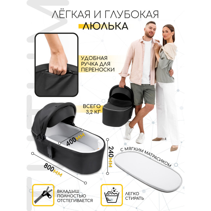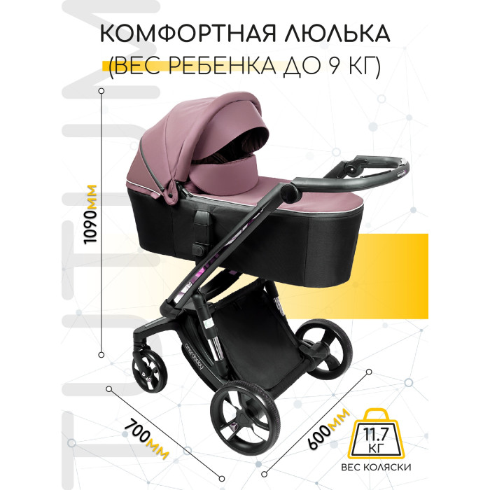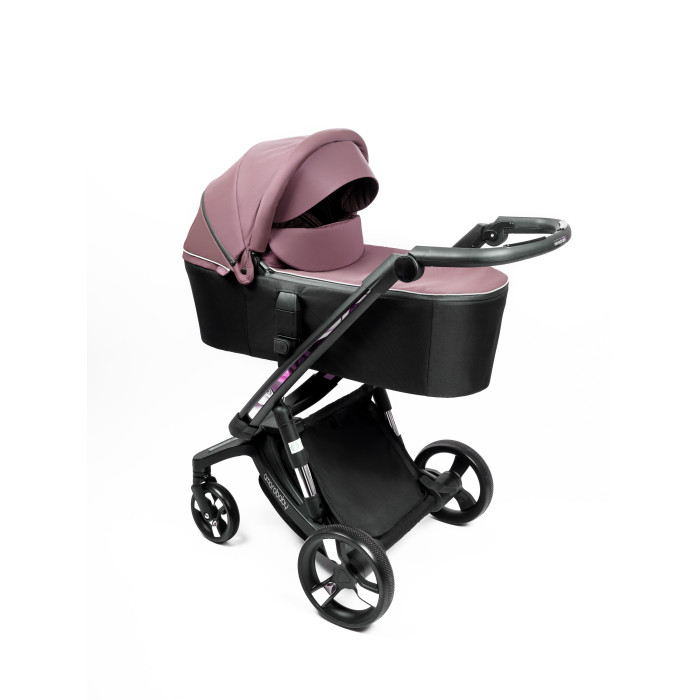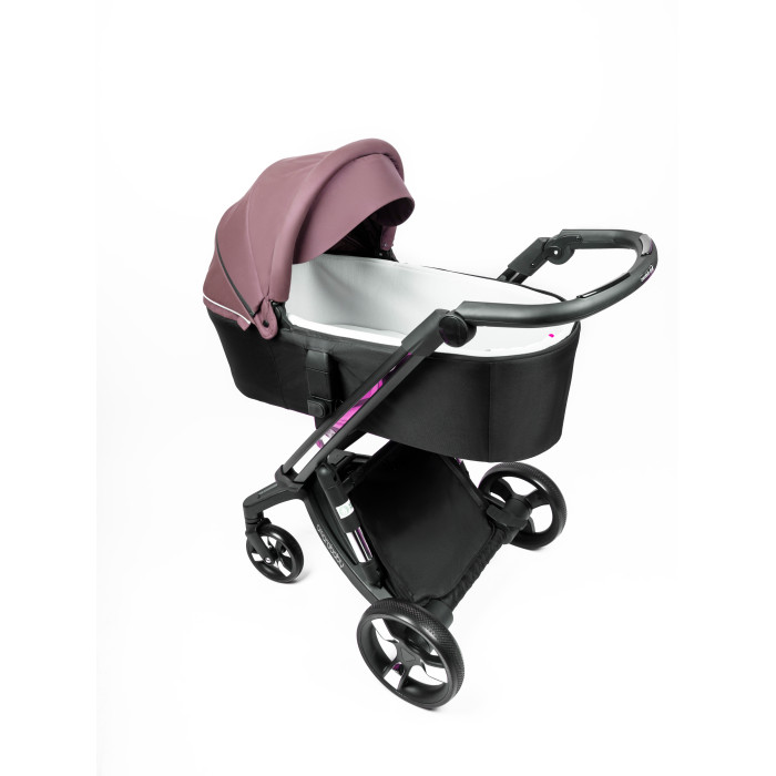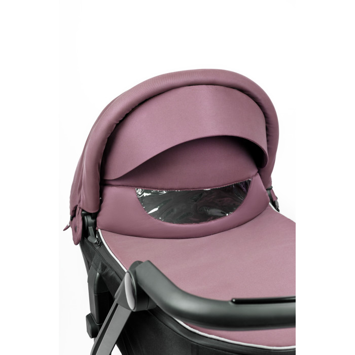 Сама коляска выглядит оригинально и интересно. Тканевая обивка представлена в широкой цветовой гамме. Обивка имеет водоотталкивающие свойства и защиту от УФ лучей. Для защиты ребенка от непогоды предусмотрена большая откидная часть на накидке на люльку, со смотровым окошком. Она практически полностью закрывает новорожденного и малыша не потревожит даже сильный ветер, дождь или снег. В теплое время года в капюшоне в люльке и в прогулочном блоке предусмотрено вентиляционное окошко. Люлька коляски имеет небольшой вес, что позволит легко переносить в люльке спящего ребенка. Люлька вместительная и имеет высокие борта.