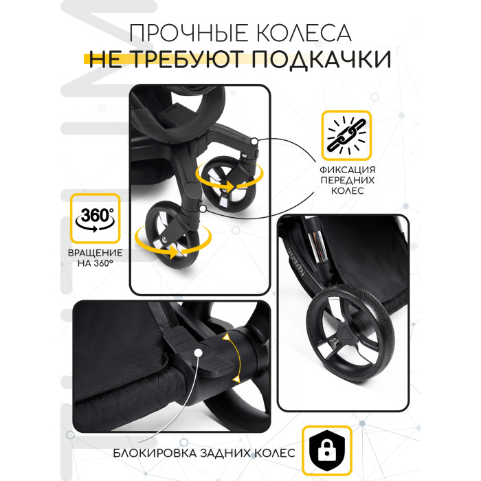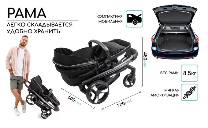 Коляска оснащена современной рамой с мягкой амортизацией. Колеса практичные и не прокалываемые. В сложенном виде коляска удобно для транспортировки.
