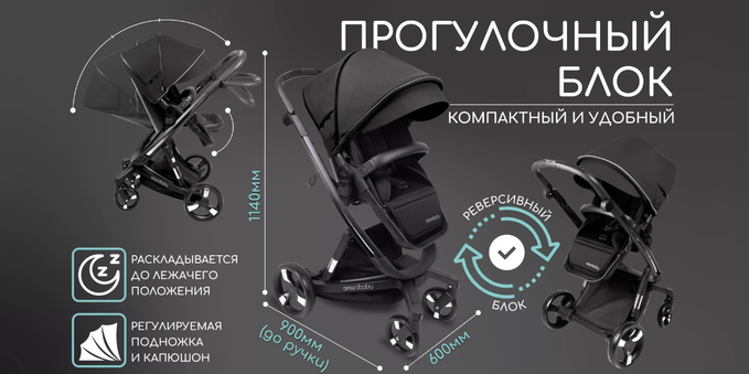 Прогулочный блок имеет реверсивное сидение. Его можно установить лицом к маме или по ходу движения. В прогулочном блоке предусмотрена регулируемая спинка и подножка. Наклон спинки осуществляется с помощью кнопки, что позволит настроить удобное положение для ребенка одной рукой. Для холодного времени года на прогулочном блоке предусмотрена удобная и теплая накидка на ножки.