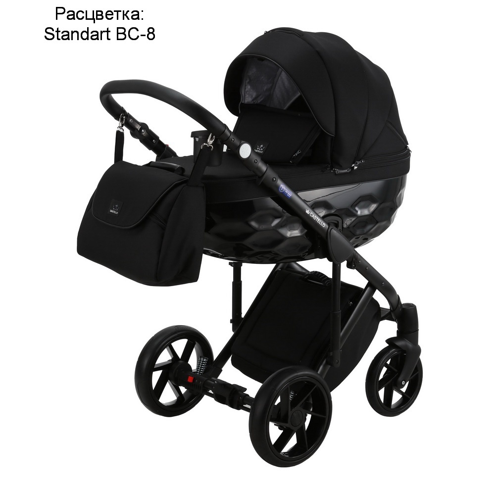 Детская коляска BeBe-Mobile Castello 2 в 1 (БеБе Мобайл Кастелло) – оригинальная коляска для ребенка с рождения до 3-4 лет с рифлёным дном. Коляска соответствует самым новым тенденциям в мире моды и дизайна и выполнена в уникальном, оригинальном стиле. Обивка выполнена из высококачественных текстильных материалов. Алюминиевая рама черного цвета оснащена новейшими центральными амортизаторами с функцией блокировки и амортизаторами на задней колесной оси с регуляцией жесткости. Такое сочетание амортизации с современными гелевыми колесами делает коляску настоящим "внедорожником", который не боится плохих дорог или их отсутствия. Коляска будет катится мягко и плавно не тревожа ребенка. Колеса не имеют камеры внутри, не прокалываются и не требуют какого то специального обслуживания. Рама коляски очень просто и компактно складывается.