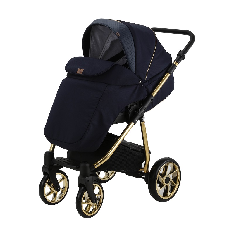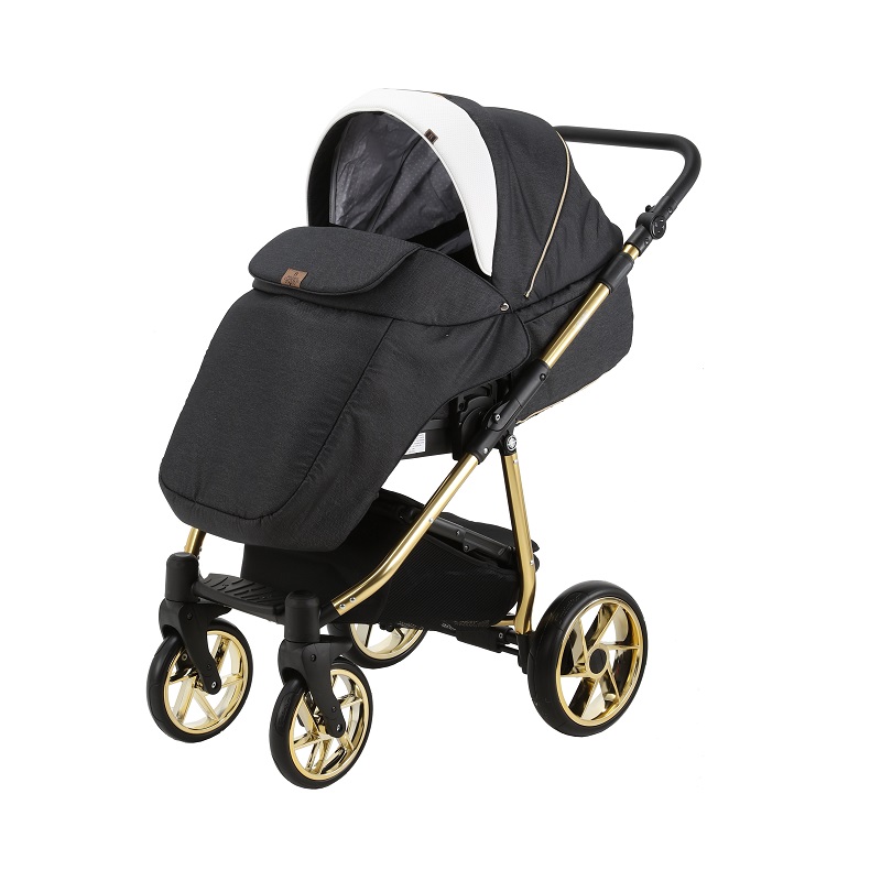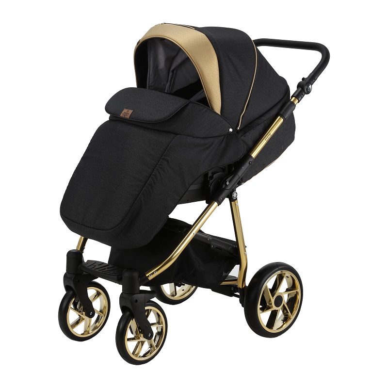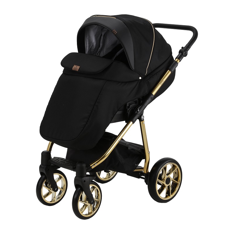 Шасси модели выполнено в золотом цвете и имеет удобную систему сложения. Коляска быстро складывается до компактных размеров и удобна для хранения и транспортировки. Продуманная амортизация модели делает ход коляски мягким и плавным. Все колеса гелевые, не прокалываемые и бескамерные. За такими колесами легко ухаживать и очень долговечны. Передние колеса поворотные, с возможностью фиксации в положение только прямо.