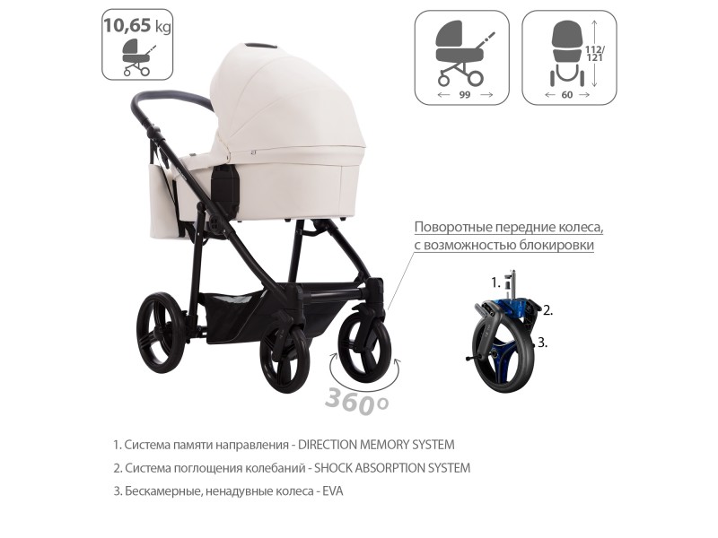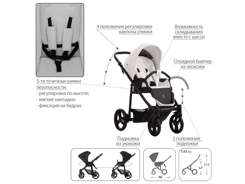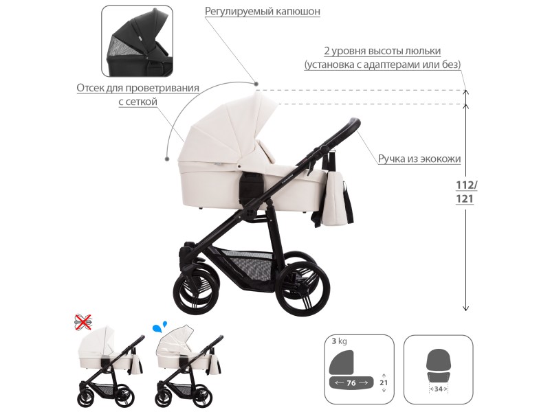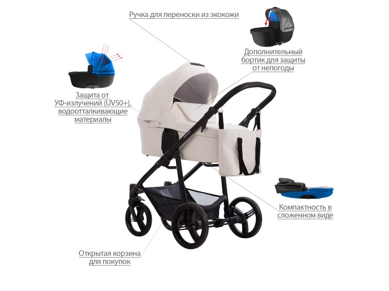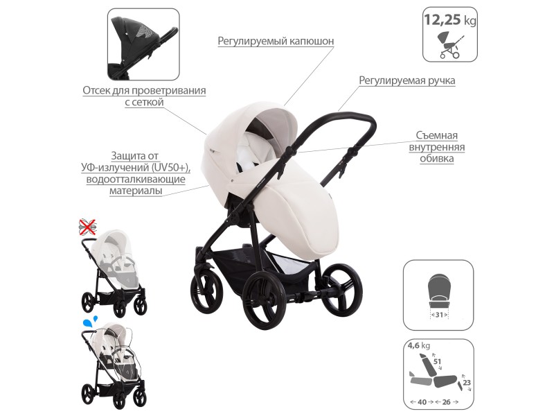 - Обивка коляски: водоотталкивающая, съемная, с УФ-защитой 50+.