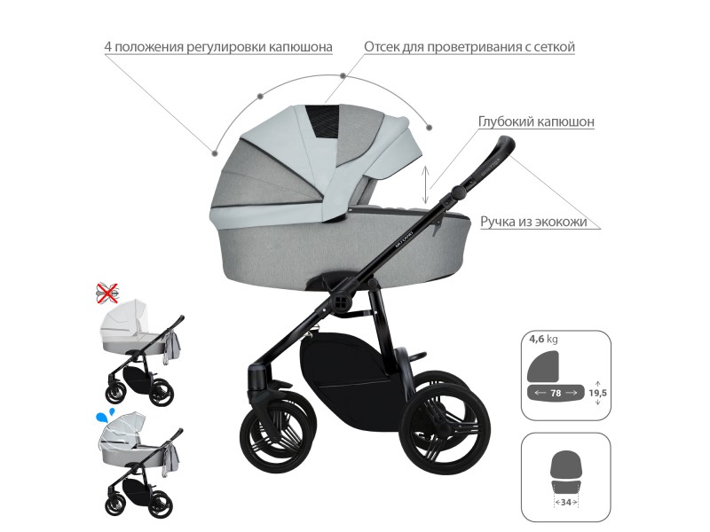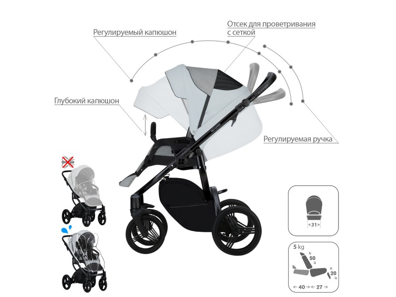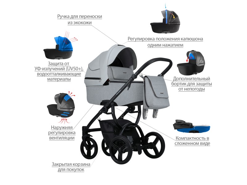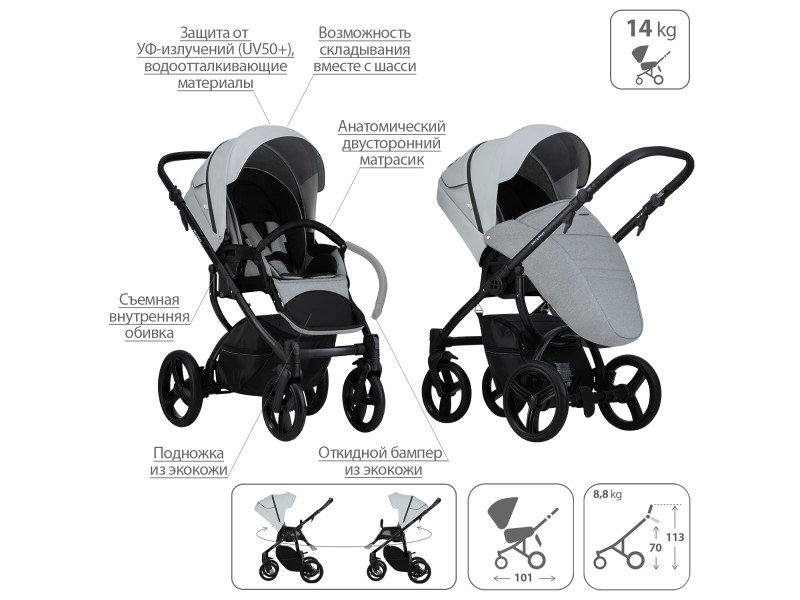 - Обивка коляски: водоотталкивающая, съемная, с УФ-защитой 50+.