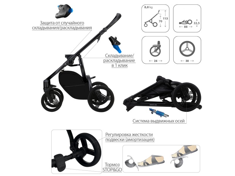 - Автоматическая блокировка коляски во время раскладывания (AUTO-BLOCKER).