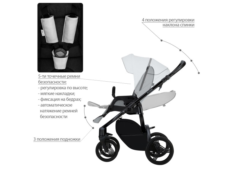 - Регулируемые 5-точечные ремни безопасности с мягкими накладками на плечи.