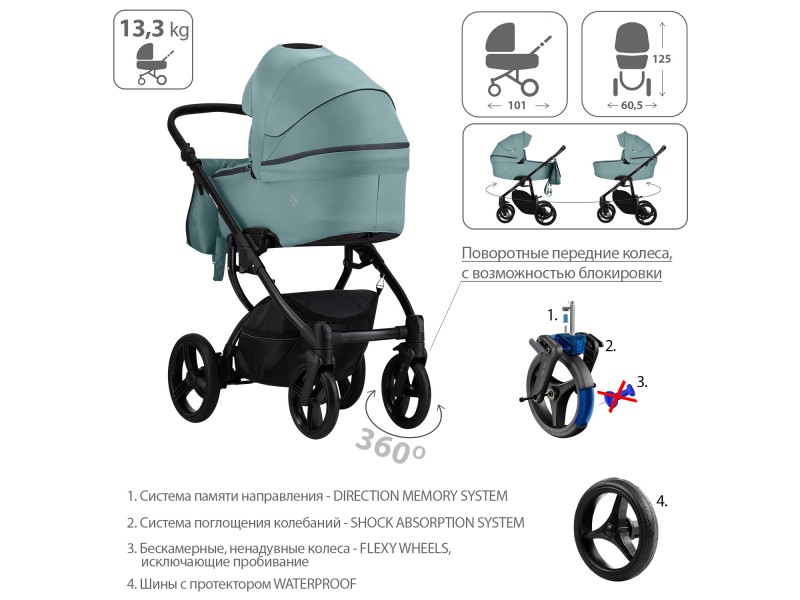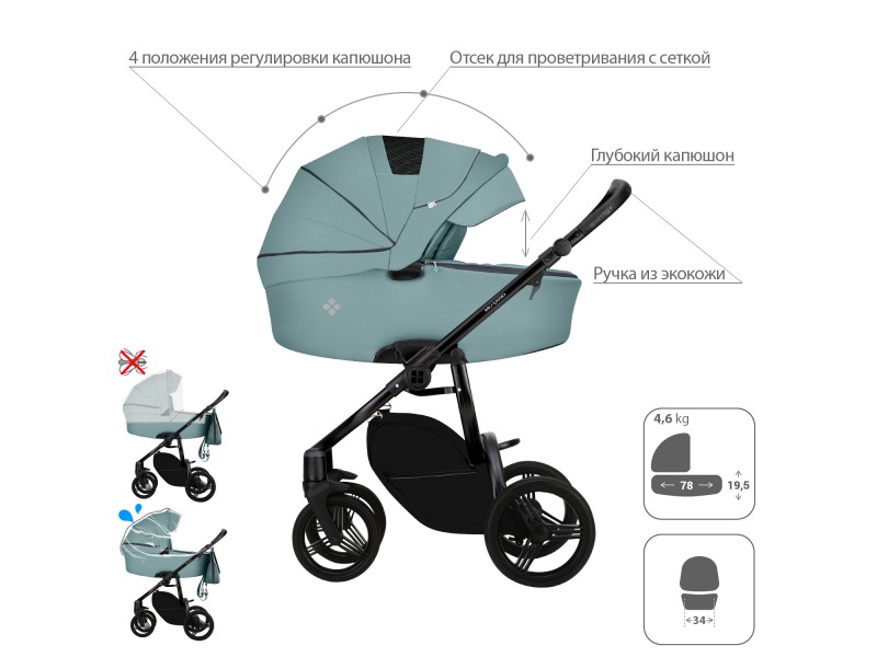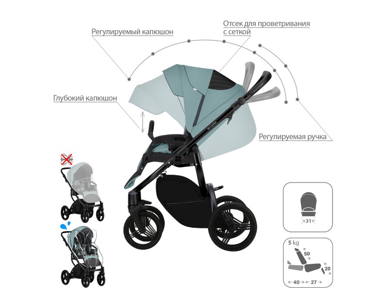- Обивка коляски: водоотталкивающая, съемная, с УФ-защитой 50+.