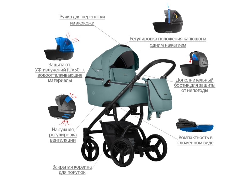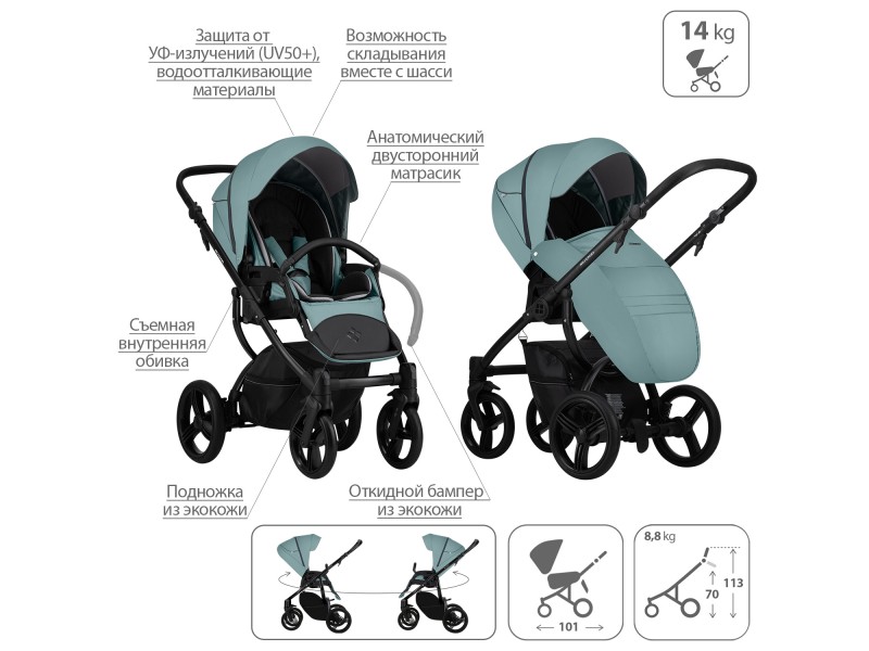 - Обивка коляски: водоотталкивающая, съемная, с УФ-защитой 50+.