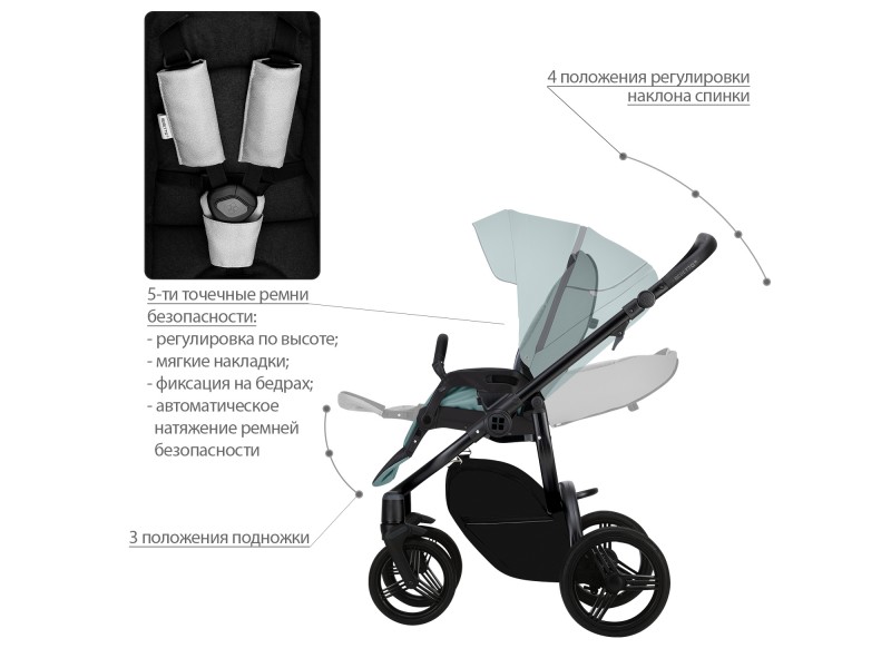 - Регулируемые 5-точечные ремни безопасности с мягкими накладками на плечи.