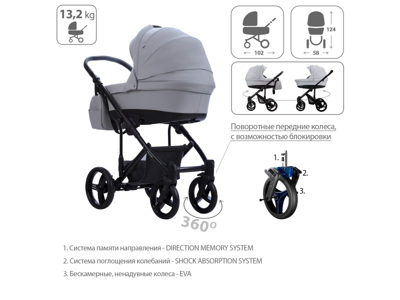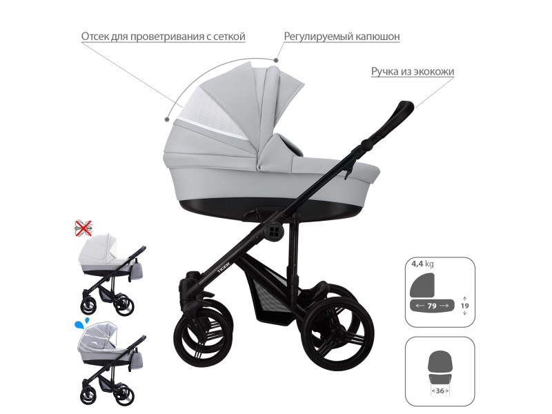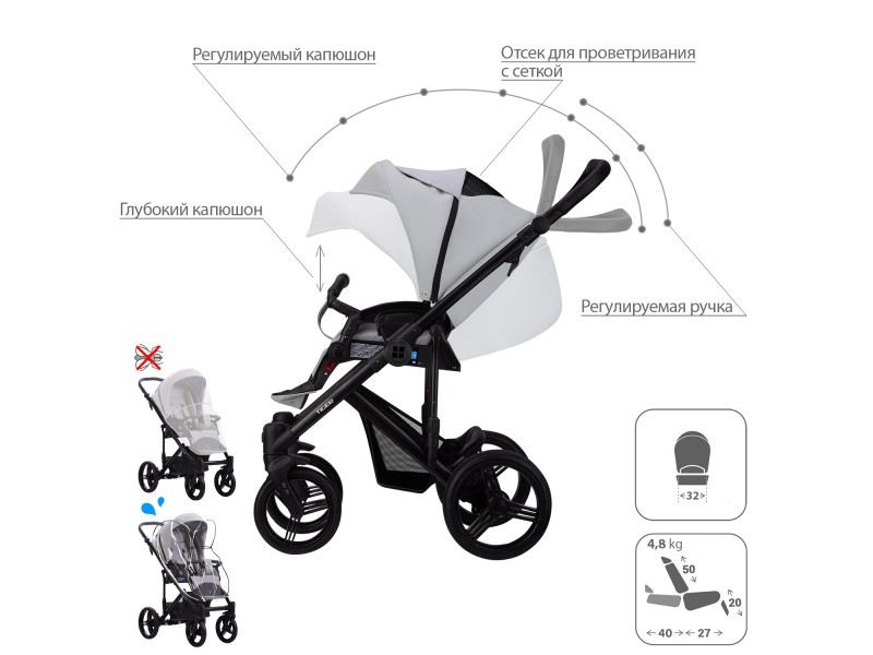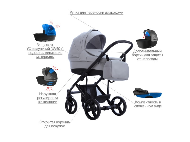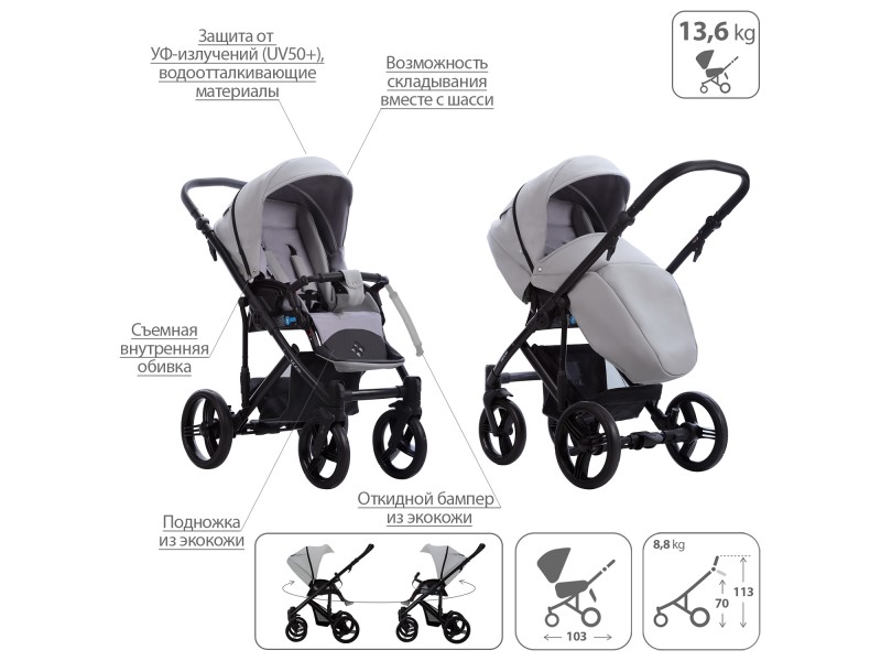 - Обивка коляски: водоотталкивающая, съемная, с УФ-защитой 50+.