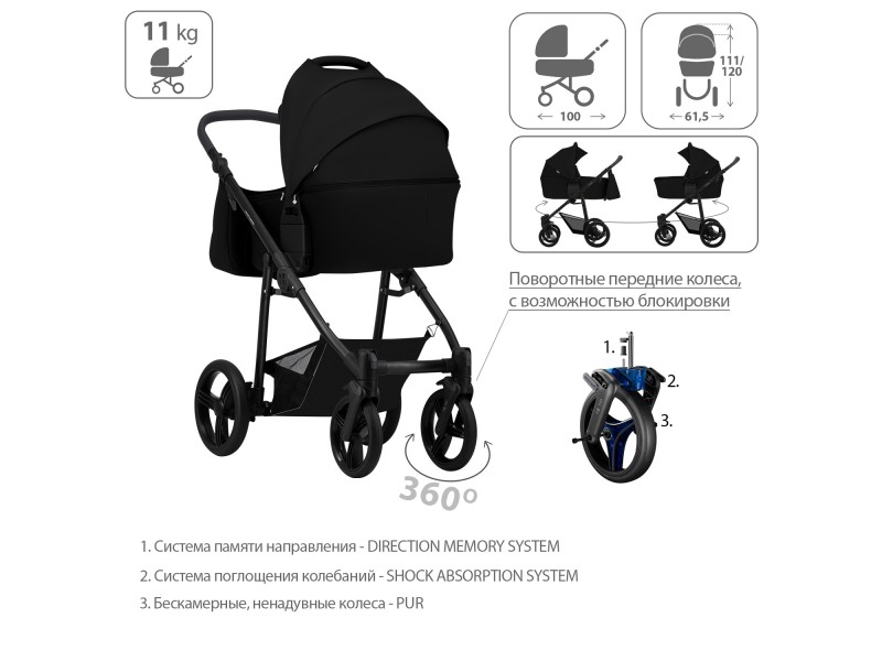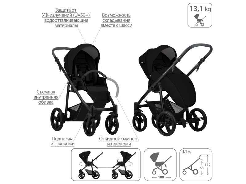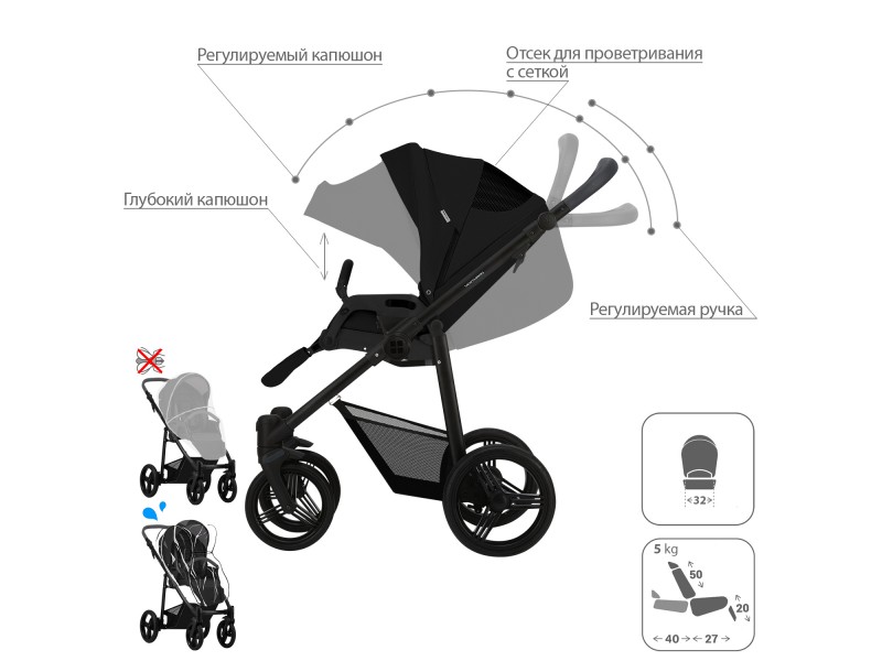 - Обивка коляски: водоотталкивающая, съемная, с УФ-защитой 50+.