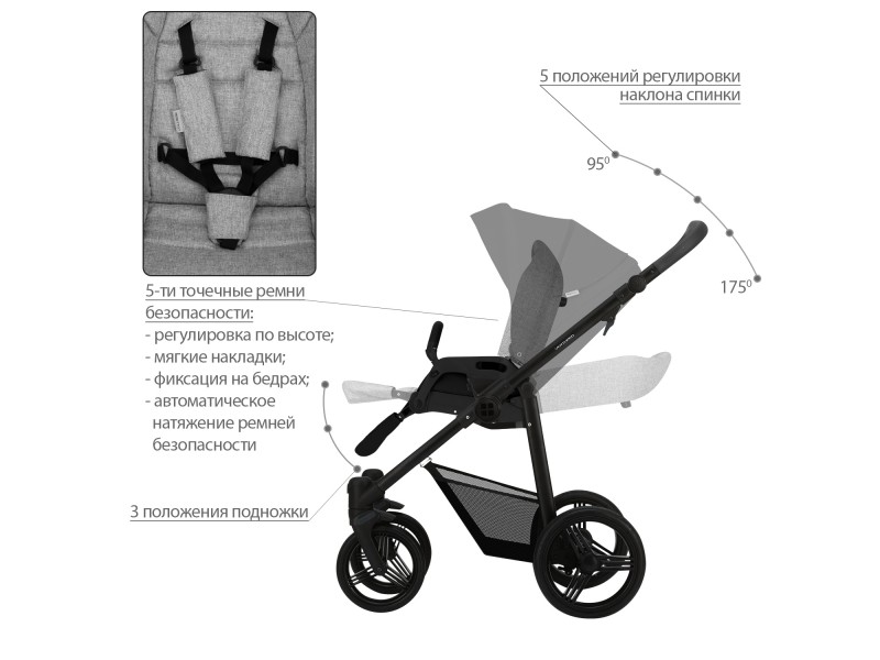 - Регулируемые 5-точечные ремни безопасности с мягкими накладками на плечи.