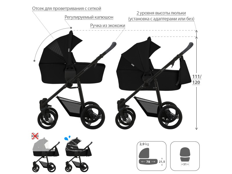 - Для переноски люльки: удобные боковые ручки, ручка на капюшоне.