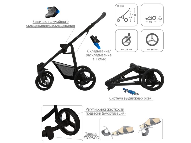 - Автоматическая блокировка коляски во время раскладывания (AUTO-BLOCKER).