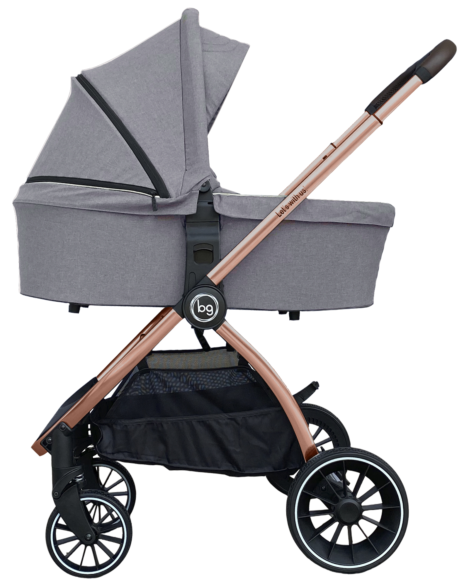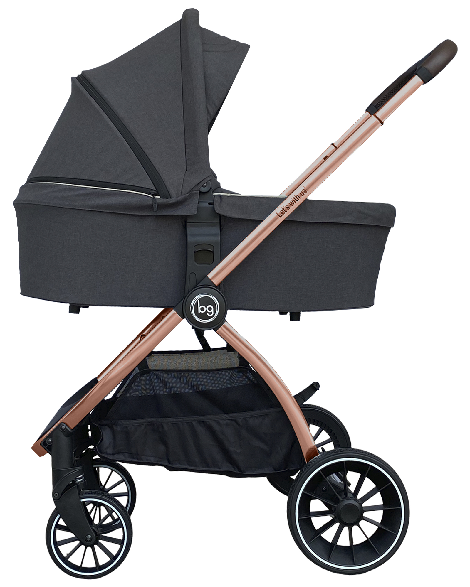 Прогулочный блок имеет просторное сидение и может легко превращаться в спальное место. Спинка и подножка имеет несколько положений регулировки вплоть до горизонтального. Эко кожа на подножке находиться на уровне обуви малыша, что позволяет не вымазывать ее вовремя прогулки. В качестве системы безопасности в прогулочном блоке используются пятиточечные ремни фиксации, съемный защитный бампер с эко кожей, механизм против сползания.