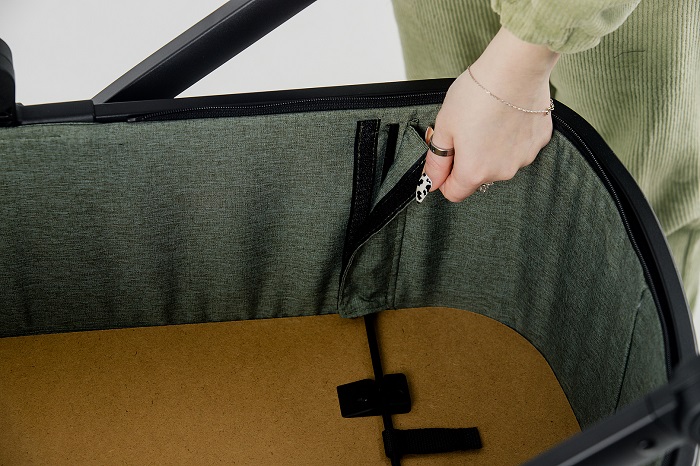 - Накидка на ножки крепится к люльке с помощью молнии.