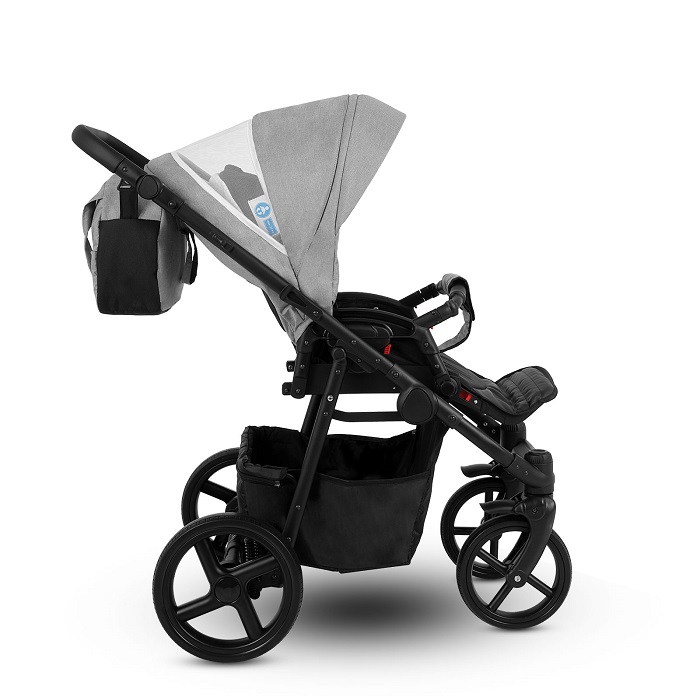 Коляска укомплектована стильной вместительной сумкой для мамы и объёмной вещевой корзиной (до 5 кг) для покупок из износостойкой ткани с удобным доступом, съёмным держателем для бутылочек, москитной сеткой и плотным дождевиком.