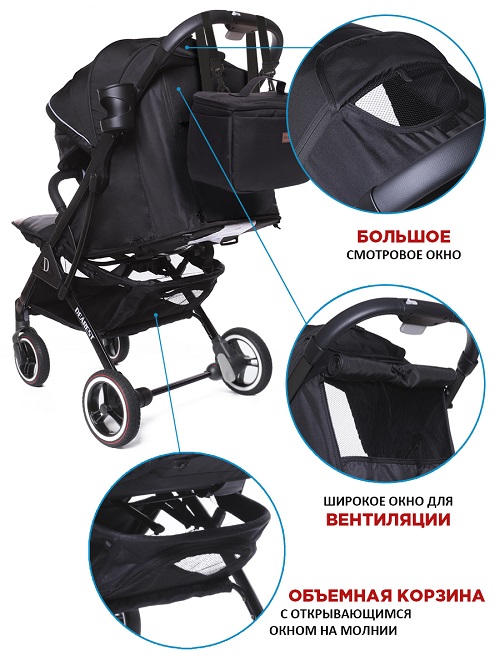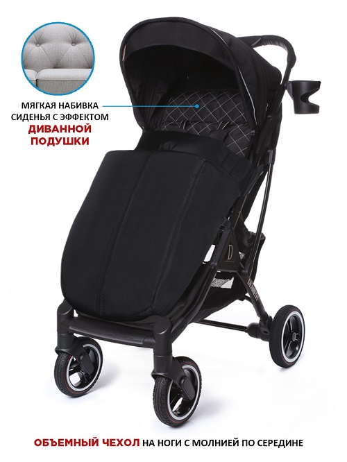 Сидение коляски очень просторное и комфортное. Длина спального места с подножкой составляет 84х39 см, что позволяет комфортно спать на улице длительное время. Само сидение коляски мягкое, выполнено с эффектом мягкого дивана. Спинка регулируется механически в нескольких положениях по высоте. Подножка из ЭКО-кожи легко моется от грязи. Коляска оснащена большим капюшоном с удобным смотровым окошком, большой вентиляционной секцией и дополнительным двойным козырьком от солнца, который можно убирать в капюшон. Обивка коляски водоотталкивающая, поэтому небольшой дождик не испортит вашу прогулку. Для прохладной погоды предусмотрена утепленная накидка на ножки с удобным доступом к малышу.