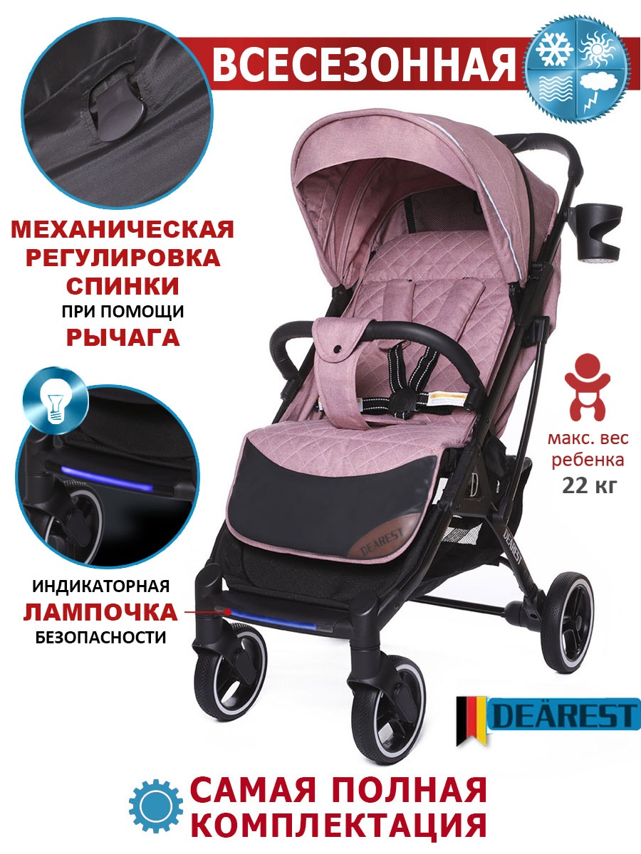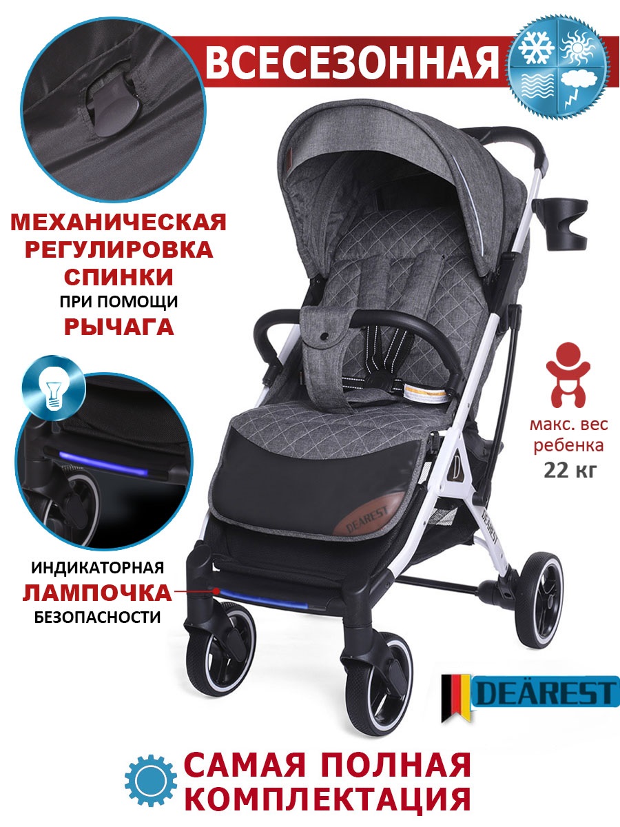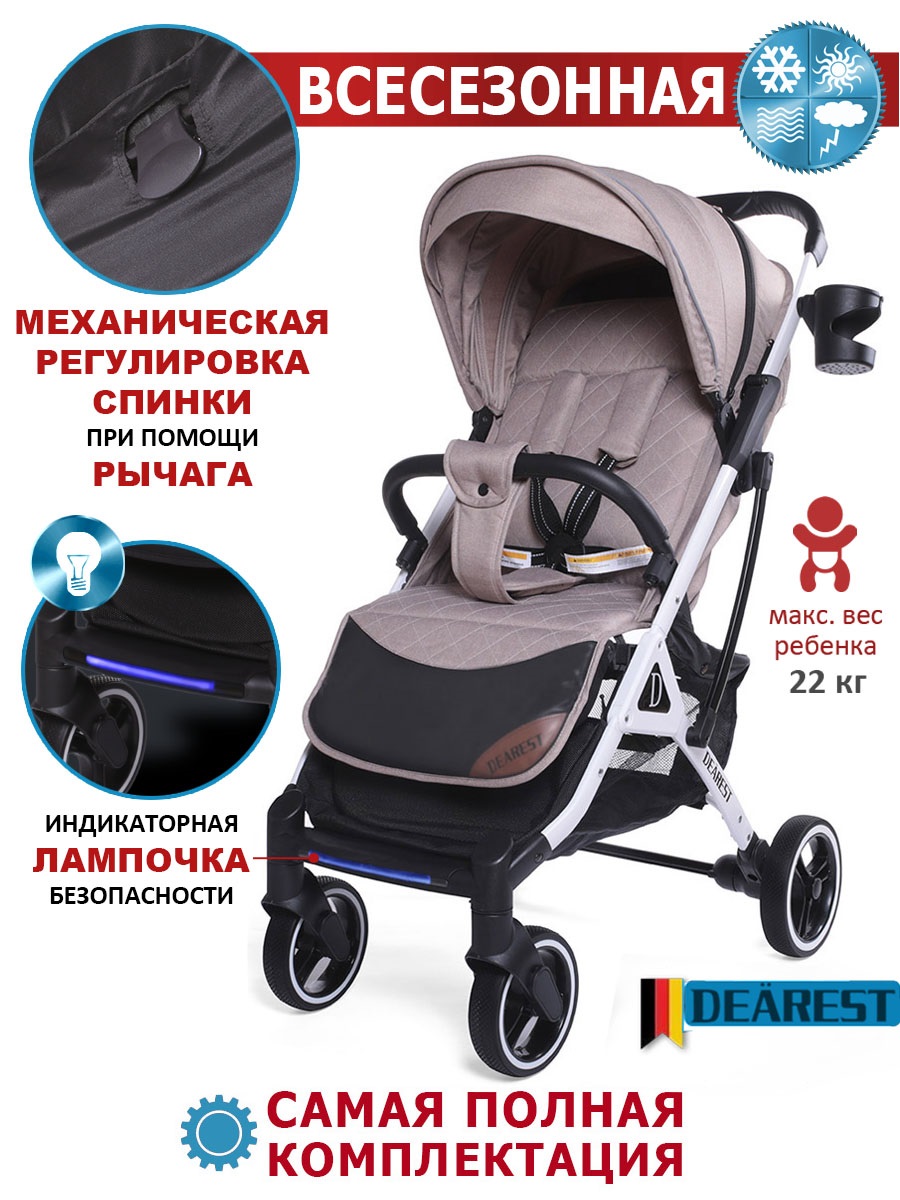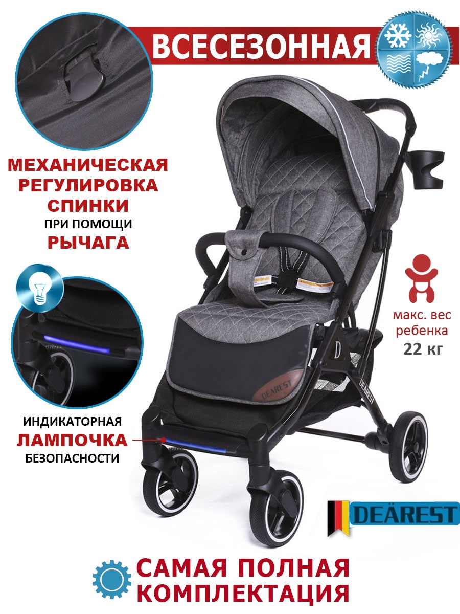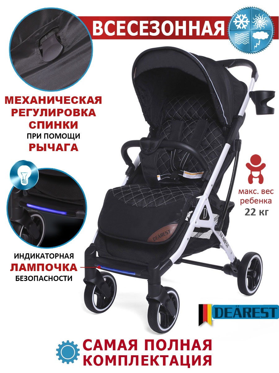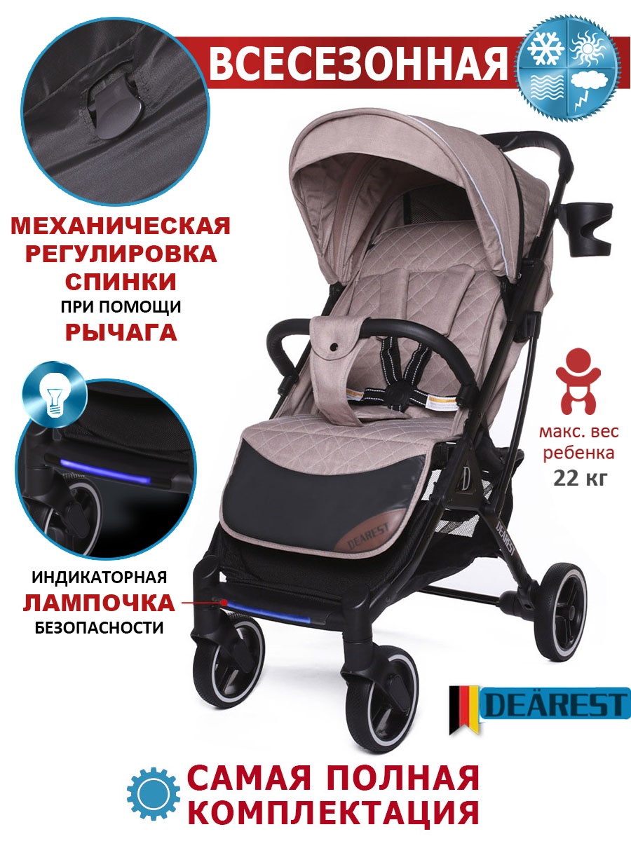 Коляска DEAREST 819 PLUS (Диарест 819 плюс) - легкая, компактная коляска с максимальной комплектацией для ребенка с рождения до 5 лет. Идеальное решение для путешествий, а так же для тех, кто ищет легкую коляску на каждый день. Коляска весит всего 8,9 кг и очень компактно складывается, позволяя брать ее с собой в любую поездку и путешествие (даже на борт самолета). При этом это полноценный "внедорожник" с крепкой, надежной алюминиевой рамой и современными резиновыми колесами с гелевой прослойкой. Такие колеса упругие, износостойкие, не боятся проколов и порезов, не требуют подкачки и не зависят от температурных колебаний на улице. Все колеса оснащены подшипниками и амортизацией, поэтому коляска едет тихо и плавно, максимально защищая ребенка от вибрации от дороги.
