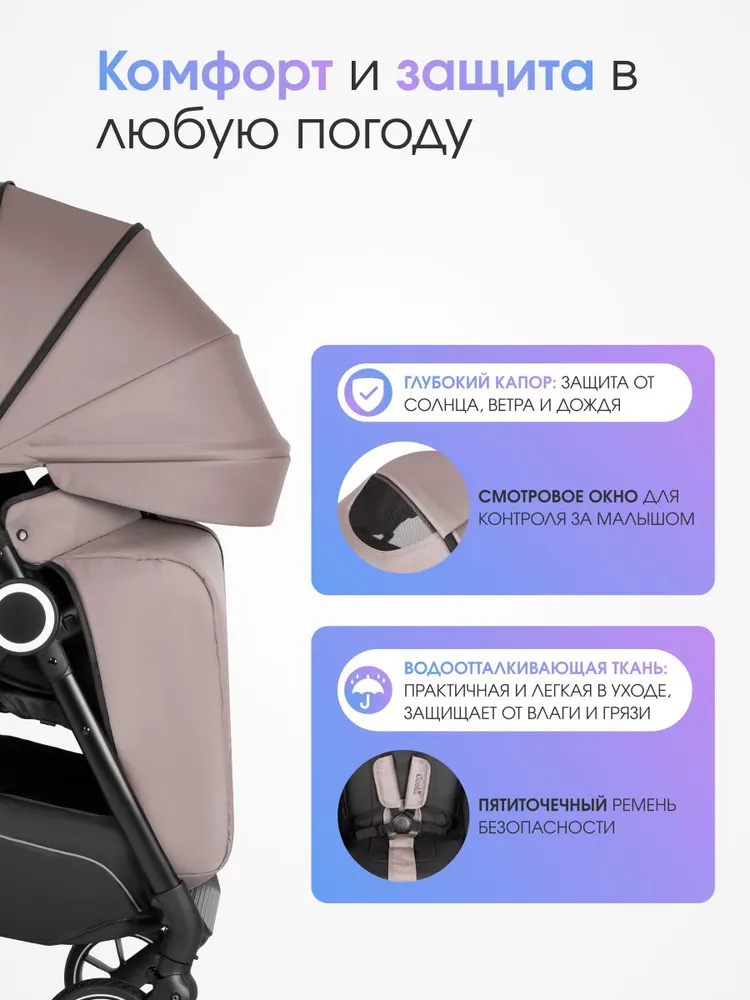 - Пятиточечные ремни безопасности и съёмный бампер обеспечивают надежную защиту во время прогулок.