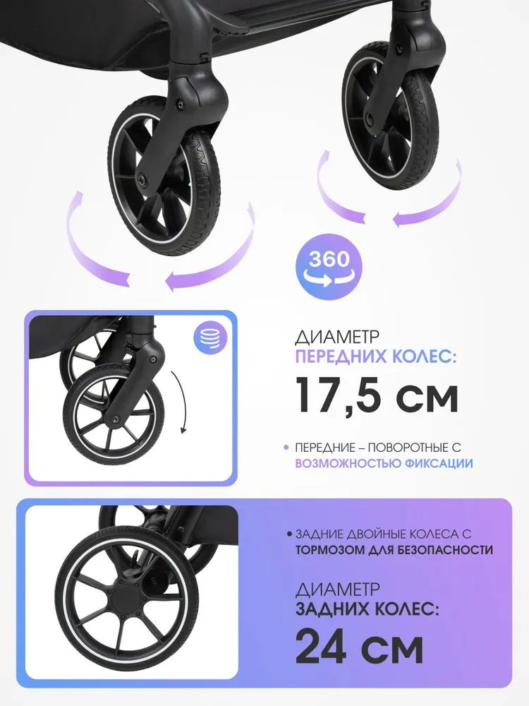 - Надёжные PU-колёса: передние – поворотные с возможностью фиксации (Ø 17,5 см), задние – Ø 24 см. Все колёса съёмные, что упрощает уход и транспортировку.