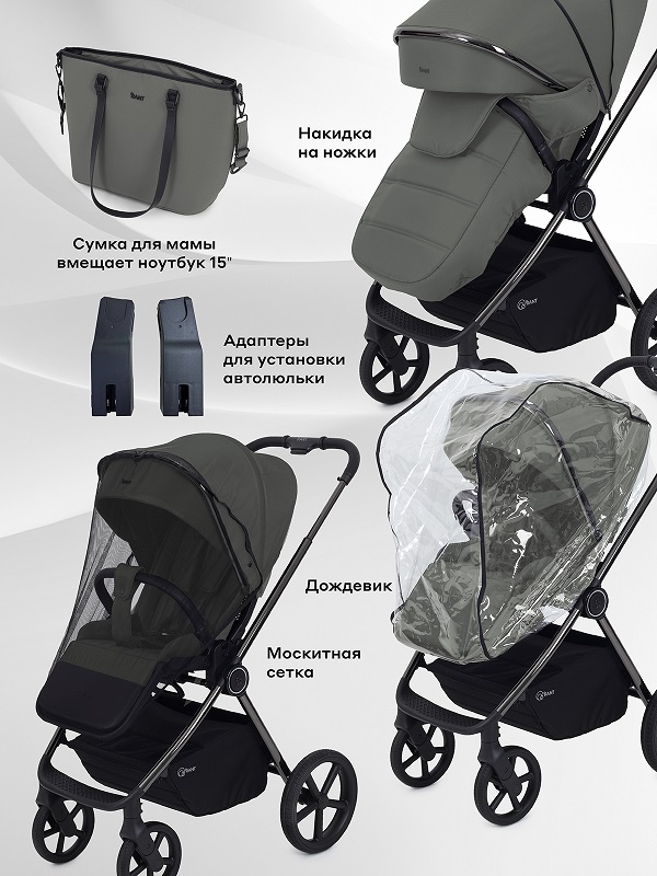 В комплекте: адаптеры для автолюльки, люлька, прогулочный блок, шасси, корзина для покупок, накидка на ножки, сумка для мамы, москитная сетка, дождевик.