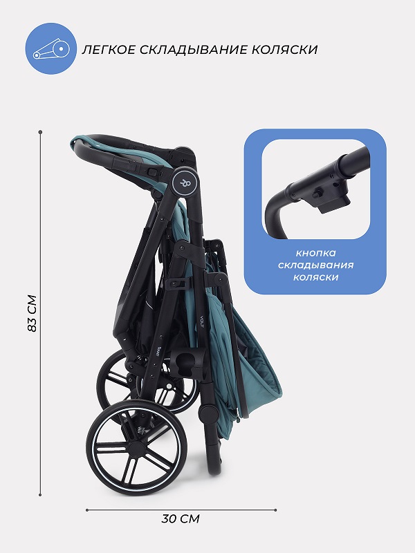 Мощные колеса, не требующие поддува, и пружинная амортизация дают коляске возможность с легкостью преодолевать препятствия на своем пути. Передние поворотные колеса дают коляске маневренность и удовольствие от управления транспортом. Ручка для родителей регулируется по высоте в большой диапазоне. Для поездок на машине коляска удобно и компактно складывается. К тому же сложенная коляска устойчиво стоит в вертикальном положении, что не дает ей испачкаться и обеспечивает комфортное хранение.