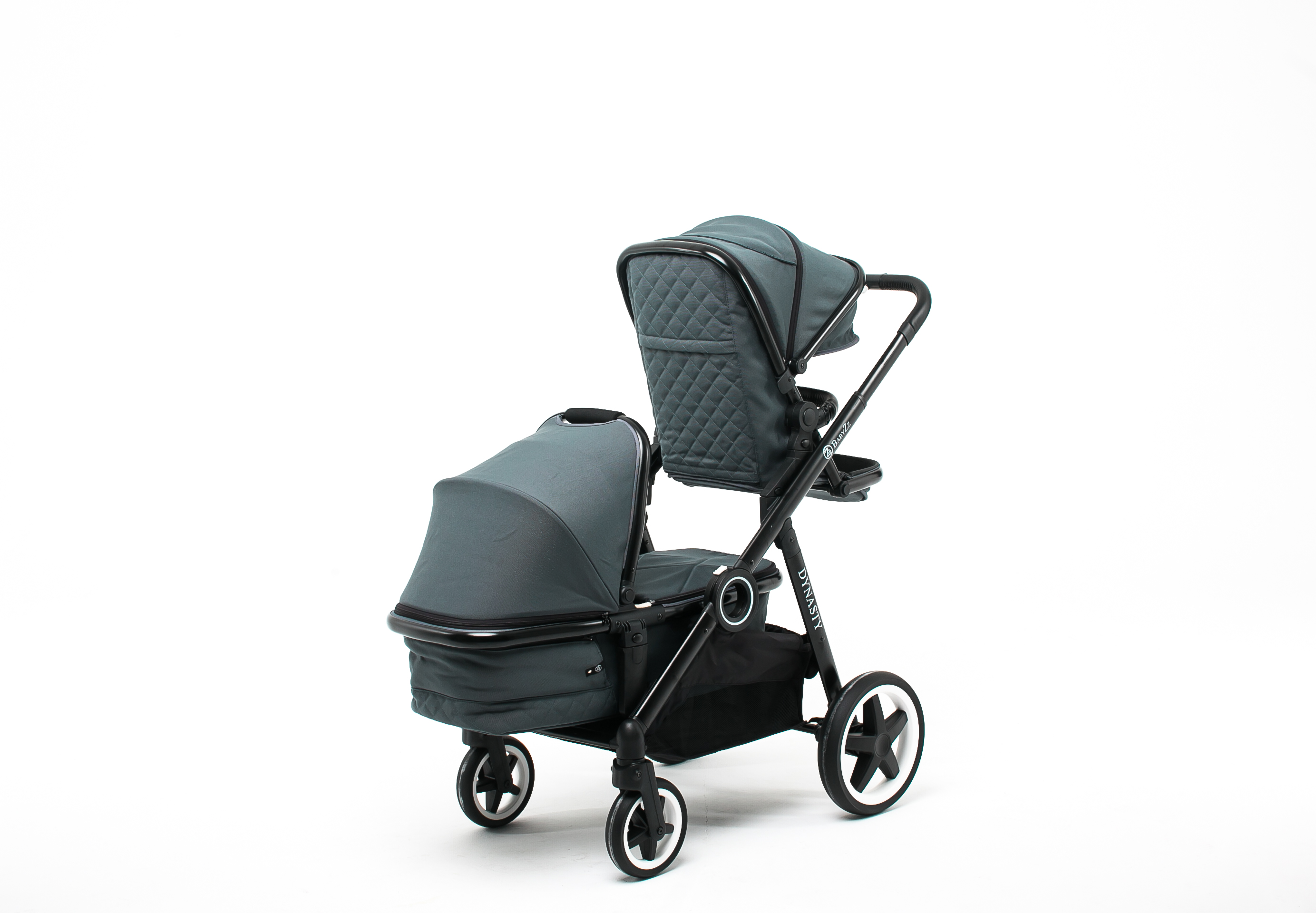 Рама коляски выполнена из алюминия, что делает ее крепкой и легкой. Имеет телескопическую родительскую ручку, обшитую кожей. Длина колесной базы составляет 60*48*91 см. Это такая же длина как на обычных модульных колясках. Весь секрет в том, что если Вам необходимо установить дополнительное сидение или люльку, Вам нужно установить основное сидение на специальный адаптер, подняв его немного выше и освободив при этом место для дополнительного сидения. Вот так, с помощью одного движения Ваша обычная коляска 2 в 1 превратиться в легкую, маневренную и комфортную коляску для двойни.