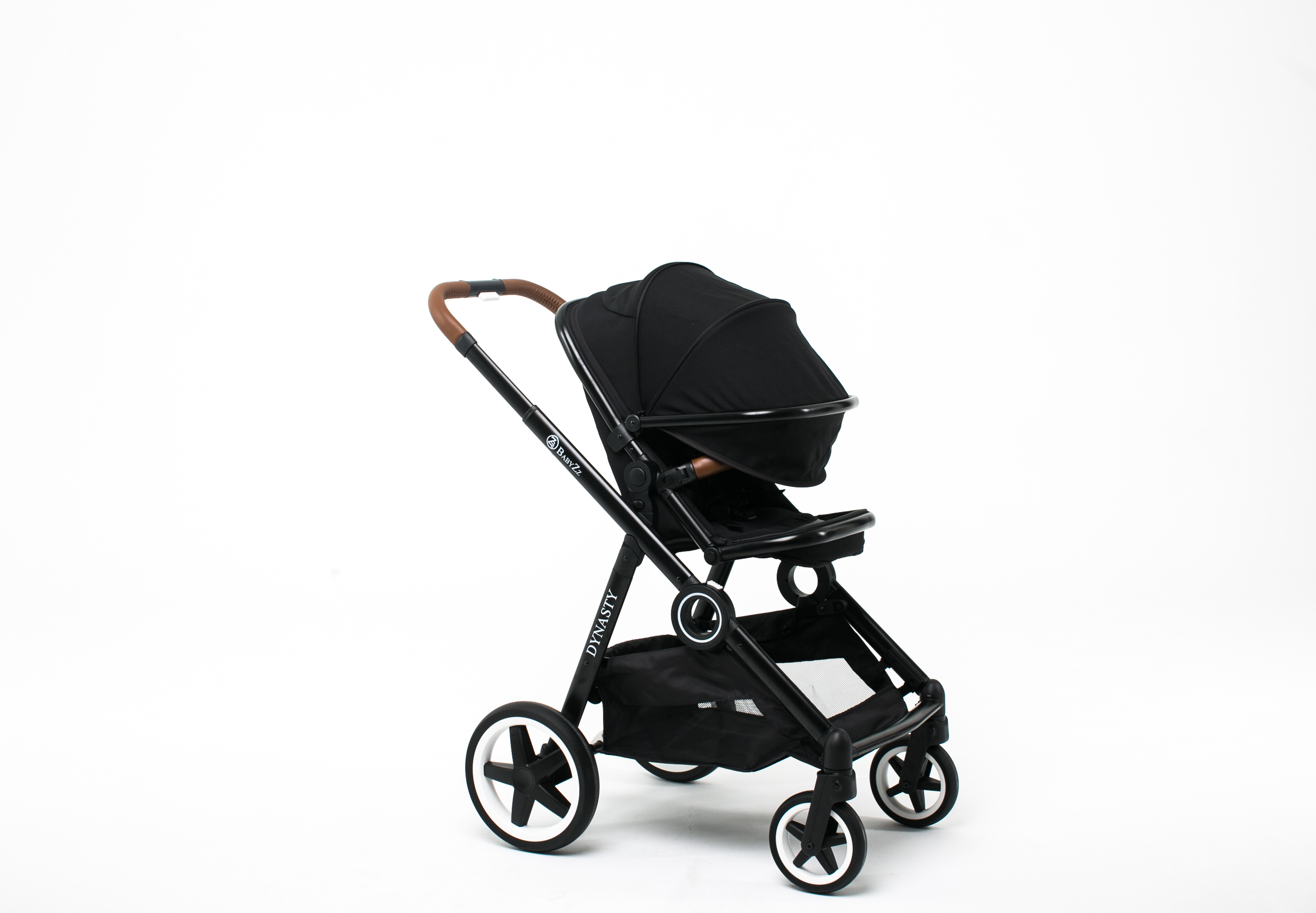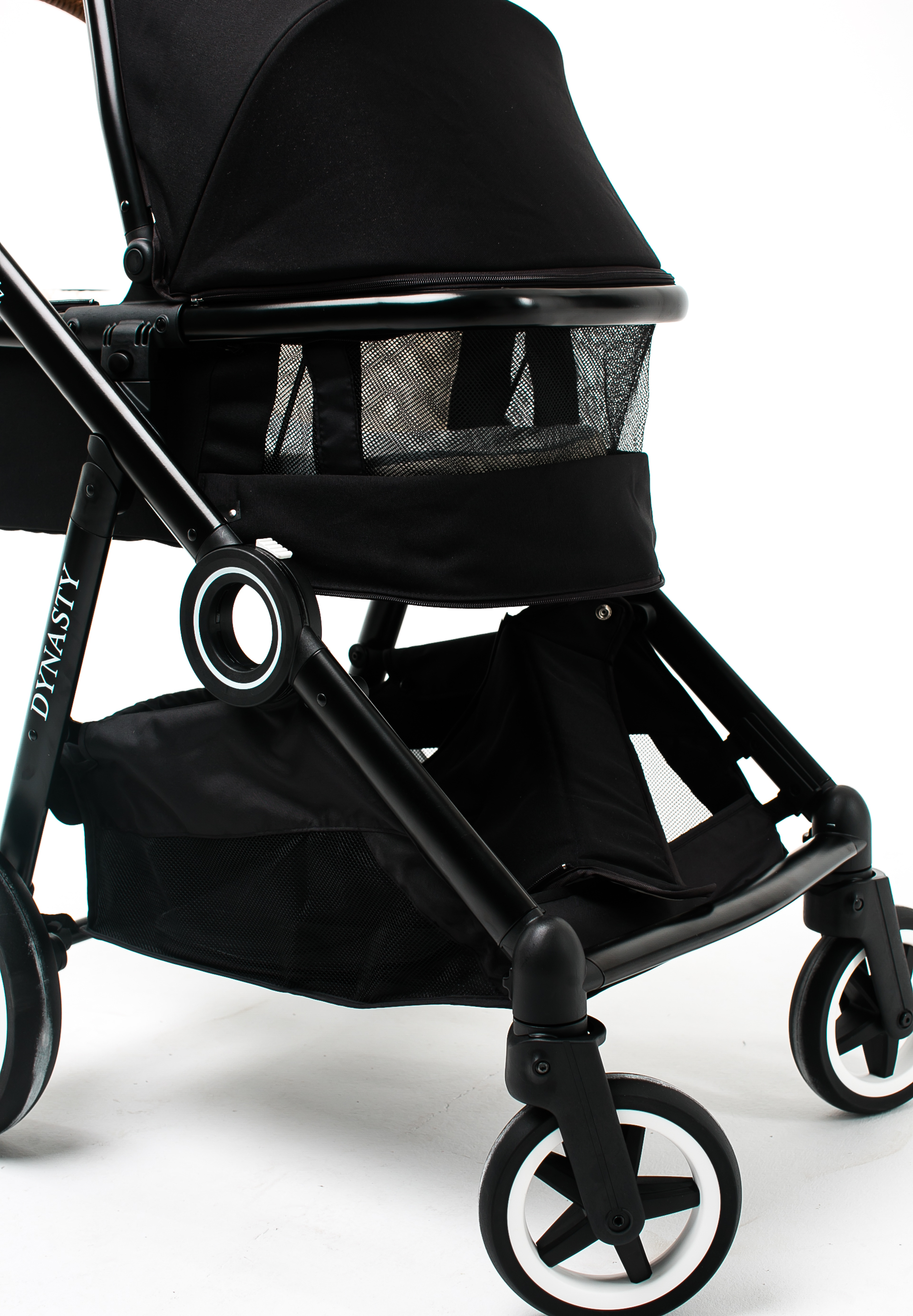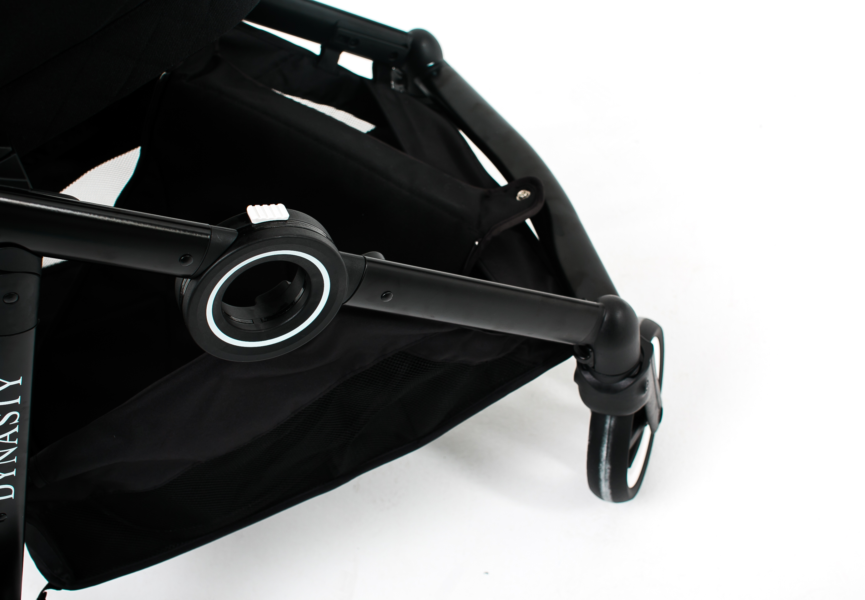 Колеса модели Dynasty имеют стильную белую окантовку, а также переднюю и заднюю амортизацию пружинного типа. Материал колёс – PU, основные свойства которого – высокая износостойкость, отсутствие скольжения, а также неизменная «мягкость» при любых температурах. Благодаря возможности вращения передних колес на 360 градусов коляска легко управляема и маневренна в городских условиях, для комфортного передвижения по бездорожью эту функцию можно заблокировать с помощью кнопок на передних колесах.