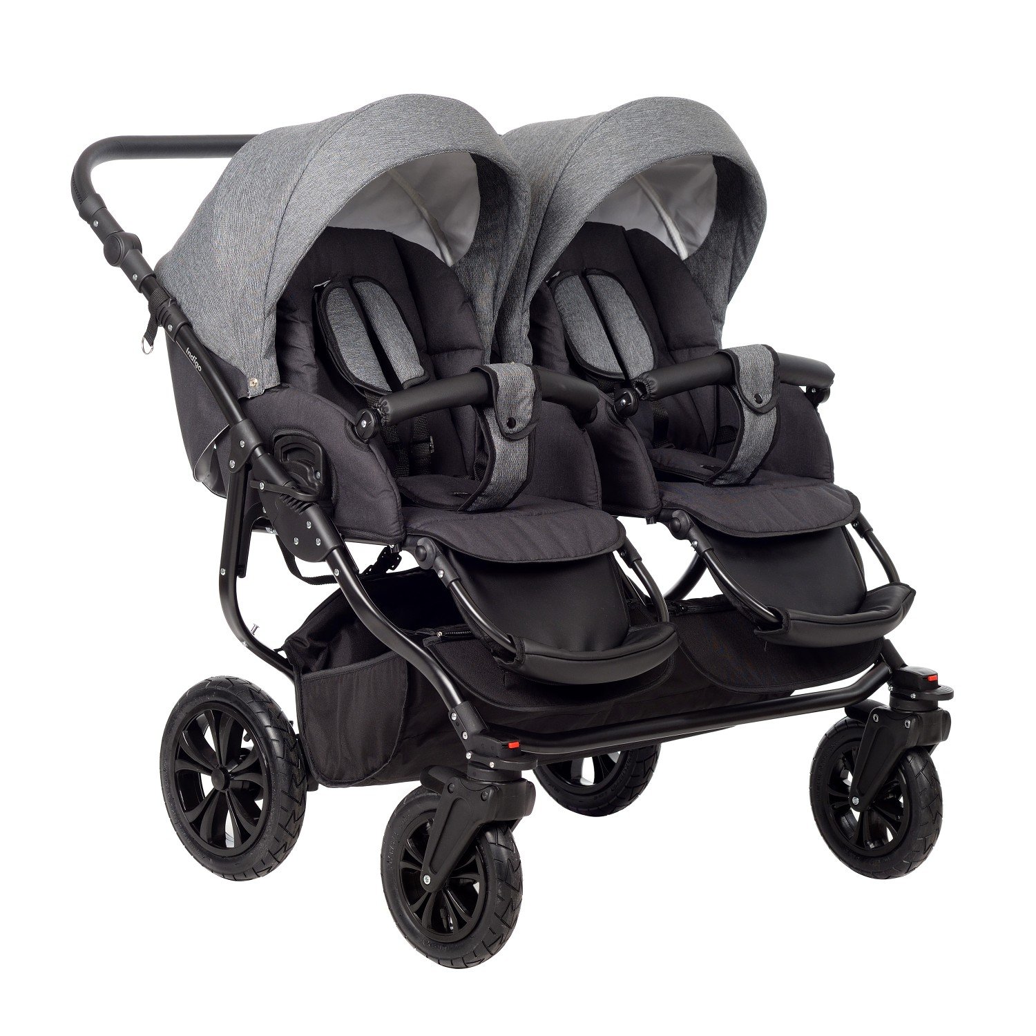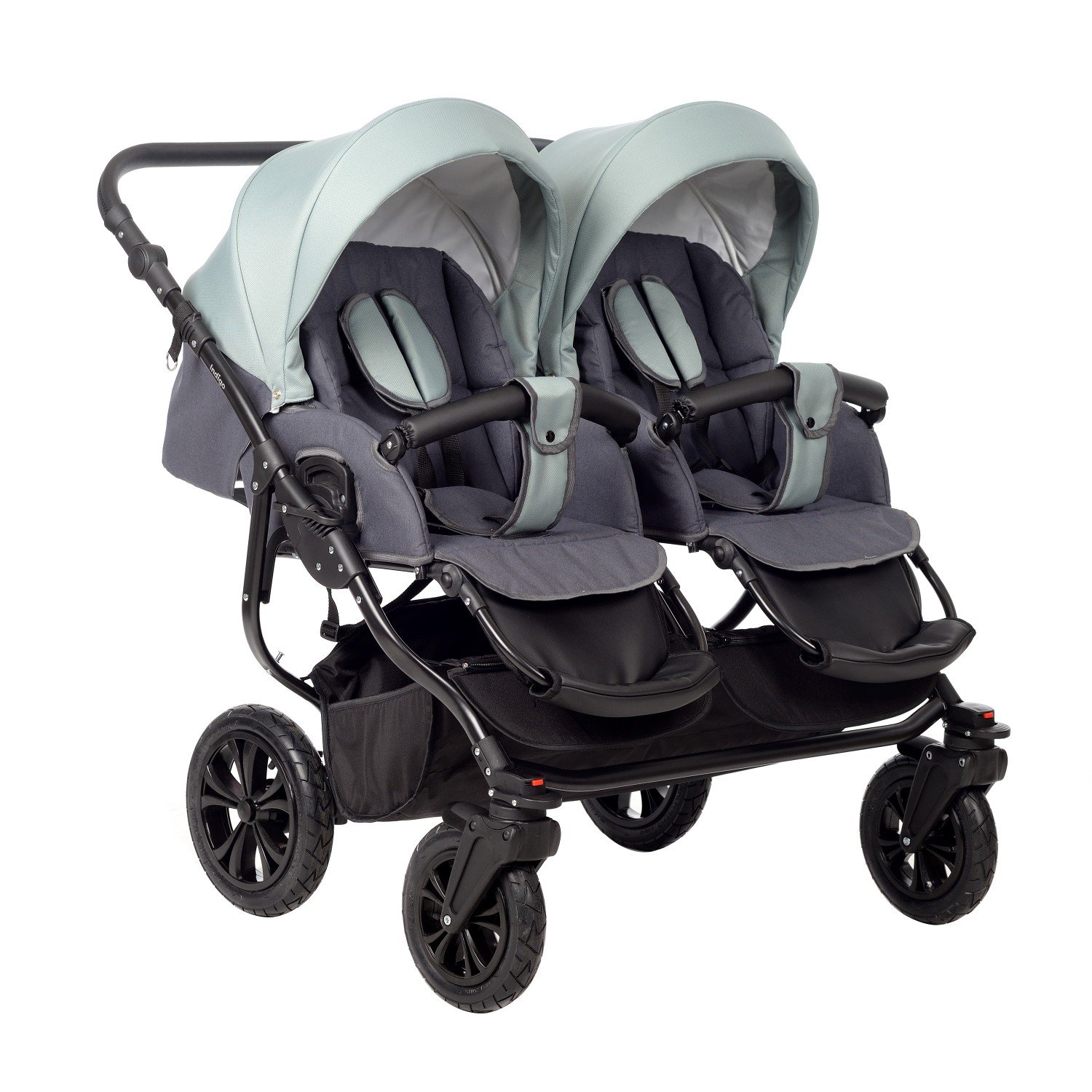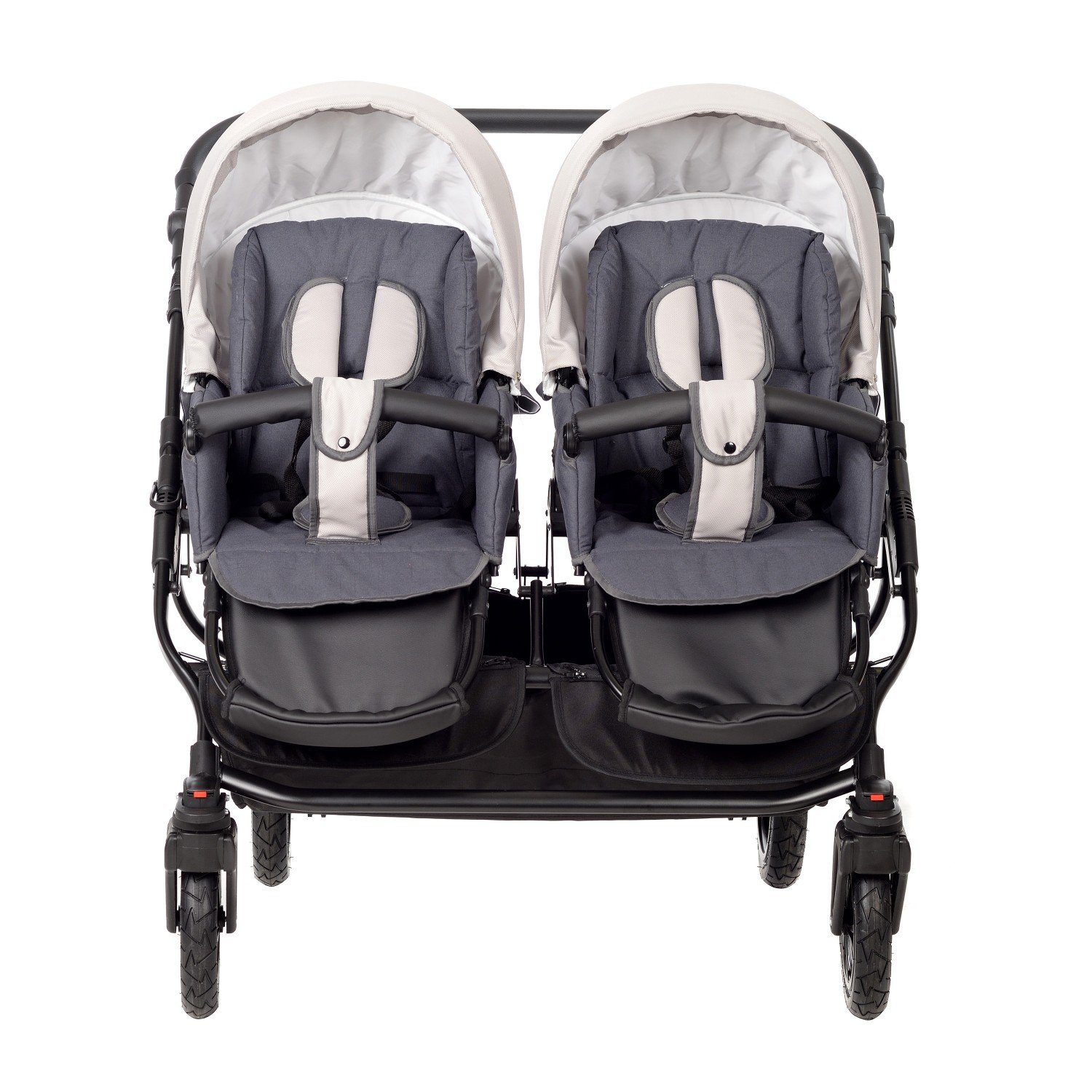 Крепкая стальная рама легко складывается книжкой. Ширина колесной базы - 96 см. Несмотря на размер, коляска маневренная и легкая в управлении. Передние поворотные колеса при желании можно зафиксировать. Благодаря регулируемой пружинная амортизации и большим надувным колесам ход у коляски мягкий даже при движении по неровной дороге. Система крепления One Touch позволяет легко устанавливать блоки как лицом, так и спиной вперед (можно установить один блок лицом к маме, а второй - по ходу движения, если настроение у малышей разное).