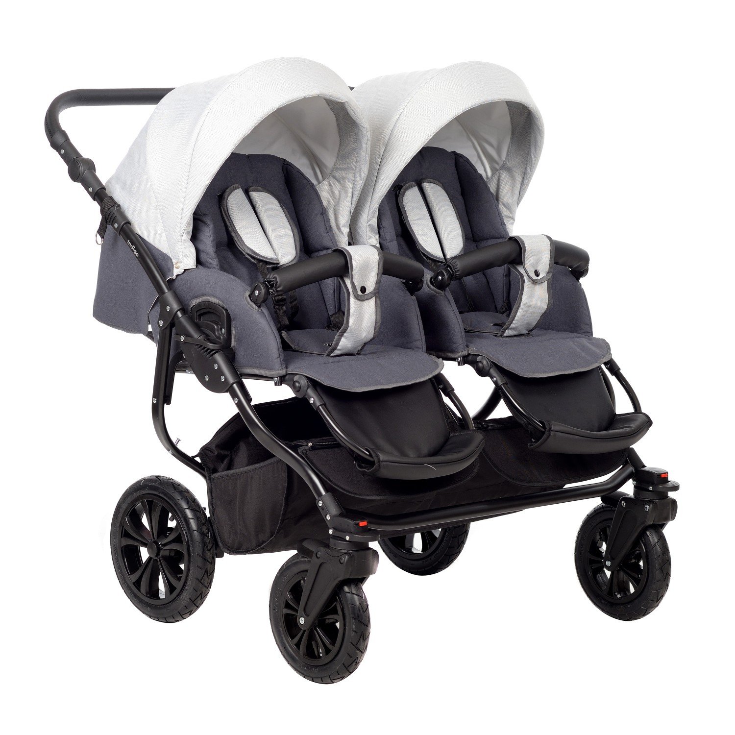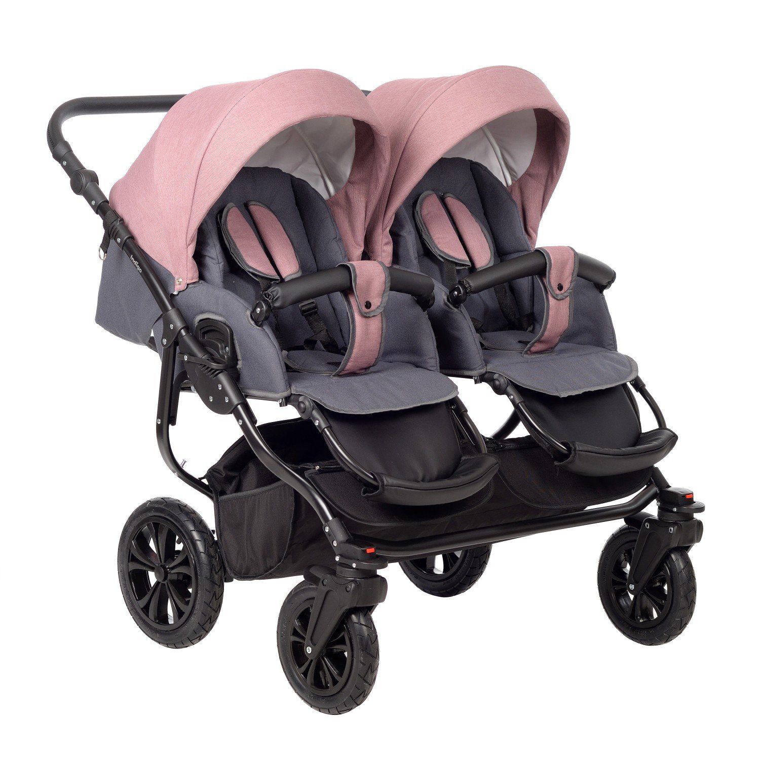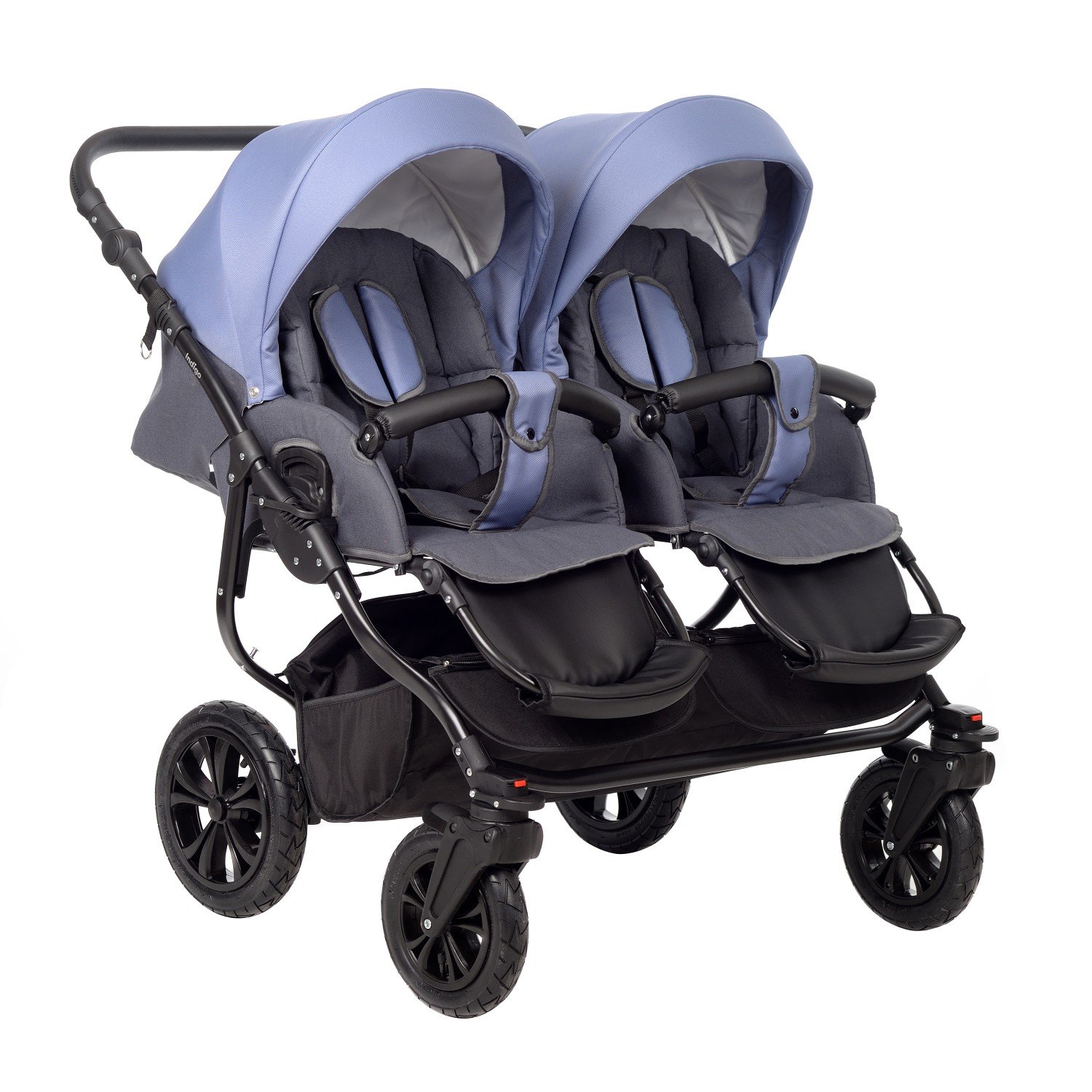 Крепкая стальная рама легко складывается книжкой. Ширина колесной базы - 96 см. Несмотря на размер, коляска маневренная и легкая в управлении. Передние поворотные колеса при желании можно зафиксировать. Благодаря регулируемой пружинная амортизации и большим надувным колесам ход у коляски мягкий даже при движении по неровной дороге. Система крепления One Touch позволяет легко устанавливать блоки как лицом, так и спиной вперед (можно установить один блок лицом к маме, а второй - по ходу движения, если настроение у малышей разное).