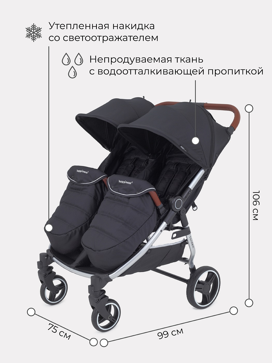 Коляска для двойни Mowbaby Tandem (Мувбеби Тандем) - облегченная прогулочная коляска для двоих детей от 7 месяцев до 3-4 лет. У коляски небольшой вес и компактное сложение, благодаря чему с коляской удобно не только гулять, но ездить на общественном транспорте или на машине. Для детей предусмотрено два вместительных, комфортных сидения с индивидуальными настройками высоты спинки, подножки, длины ремней и глубины капюшона. Капюшоны в данной модели могут закрываться до бампера, надежно укрывая детей от любой непогоды. Обивка коляски качественная, не продуваемая, с водоотталкивающими свойствами. Для прохладной погоды предусмотрены две накидки на ножки со светоотражающими элементами.
