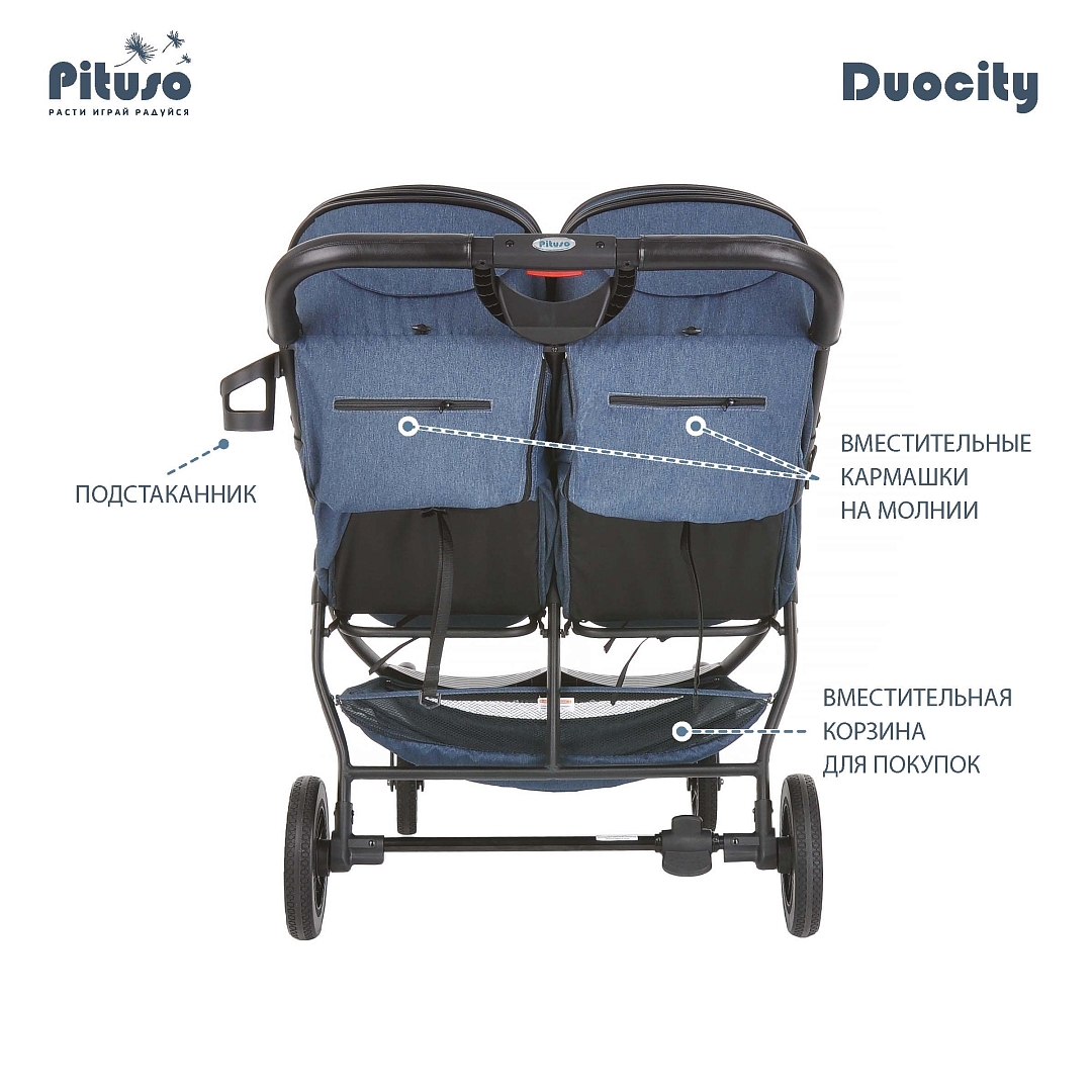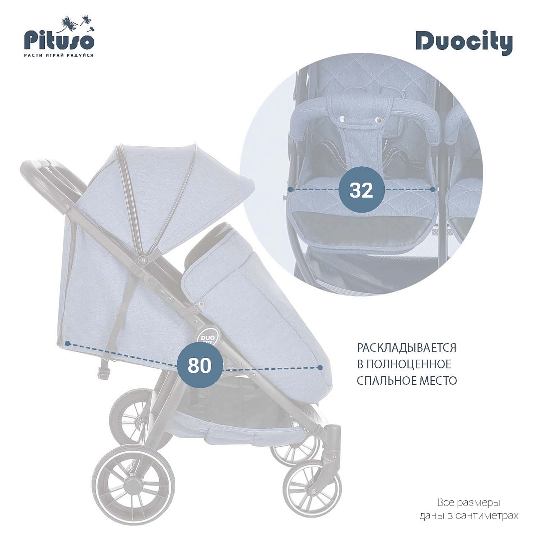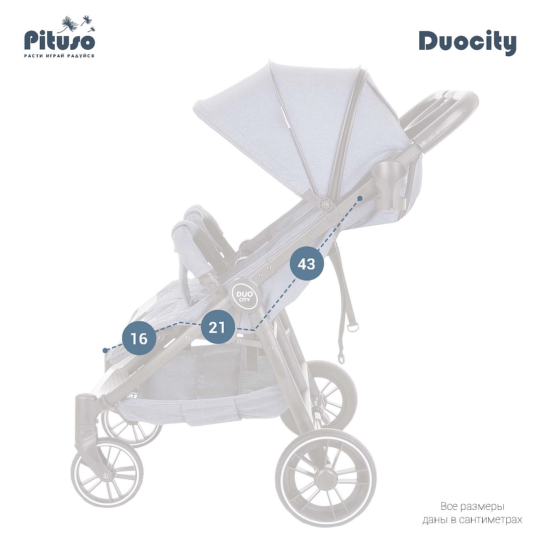 Коляска для двойни PITUSO DUOCITY PU 2021 (Питусо дуосити ева) - это новое поколение прогулочных колясок комфортных для малышей и удобных для родителей. На раме размещено 2 сидения с индивидуальными системами регулировок: подножки, капюшона и спинки. Демисезонную коляску можно использовать круглый год благодаря утепленному чехлу для ножек, колесам на подшипниках, а также удлиненному капюшону, который опускается низко до самого бампера. Модель выполнена из ветрозащитной ткани. В DUOCITY просторные мягкие сидения шириной 32 см, глубиной 21 см, высота спинки 40 см. Длина спального места составляет 78 см. Спинки регулируются по высоте в любом положении, независимо друг от друга. Удлиненный капюшон из трех частей со скрытой секцией на молнии. Капюшон дополнен козырьком на молнии. Задняя стенка капюшона полностью открывается для вентиляции, дополнена карманом для мелочей на молнии.