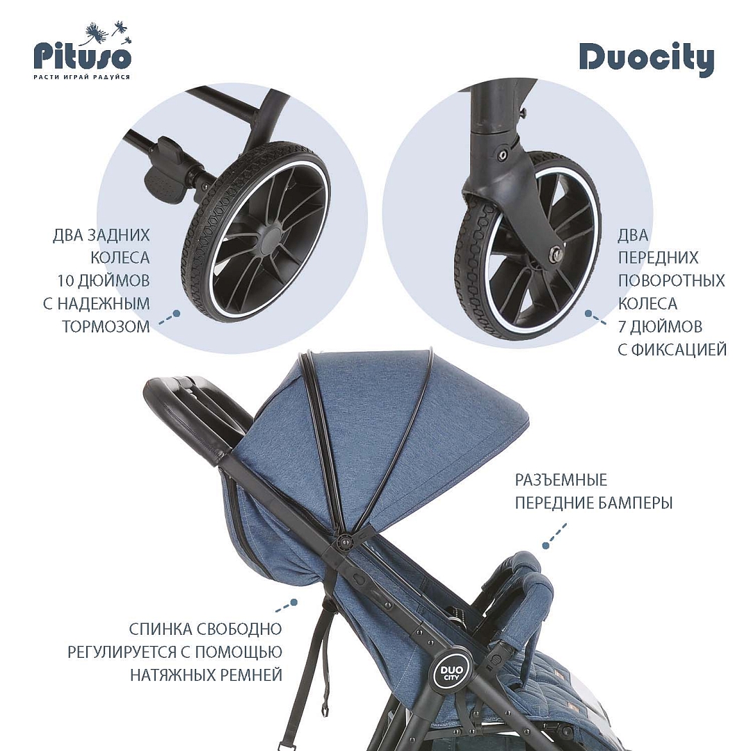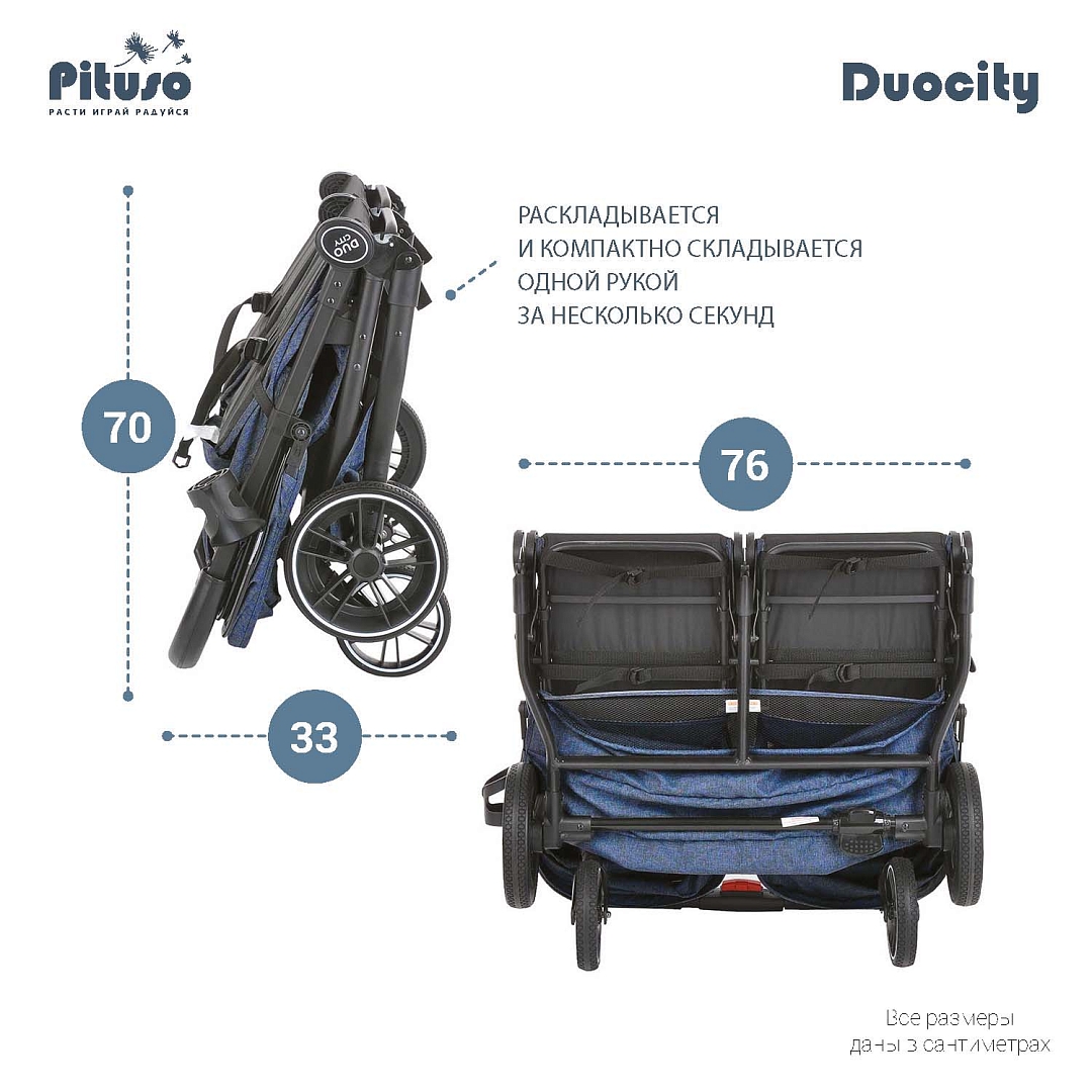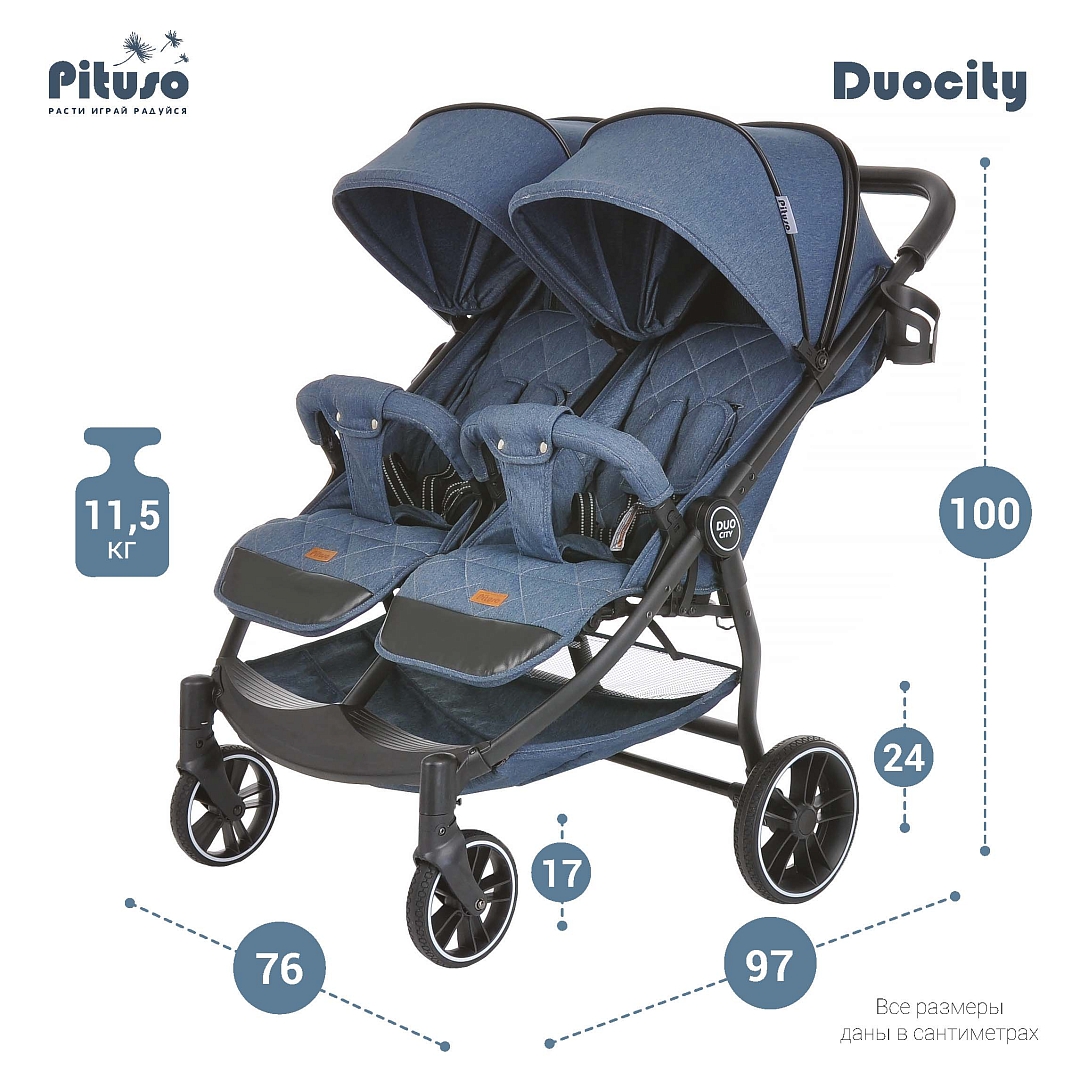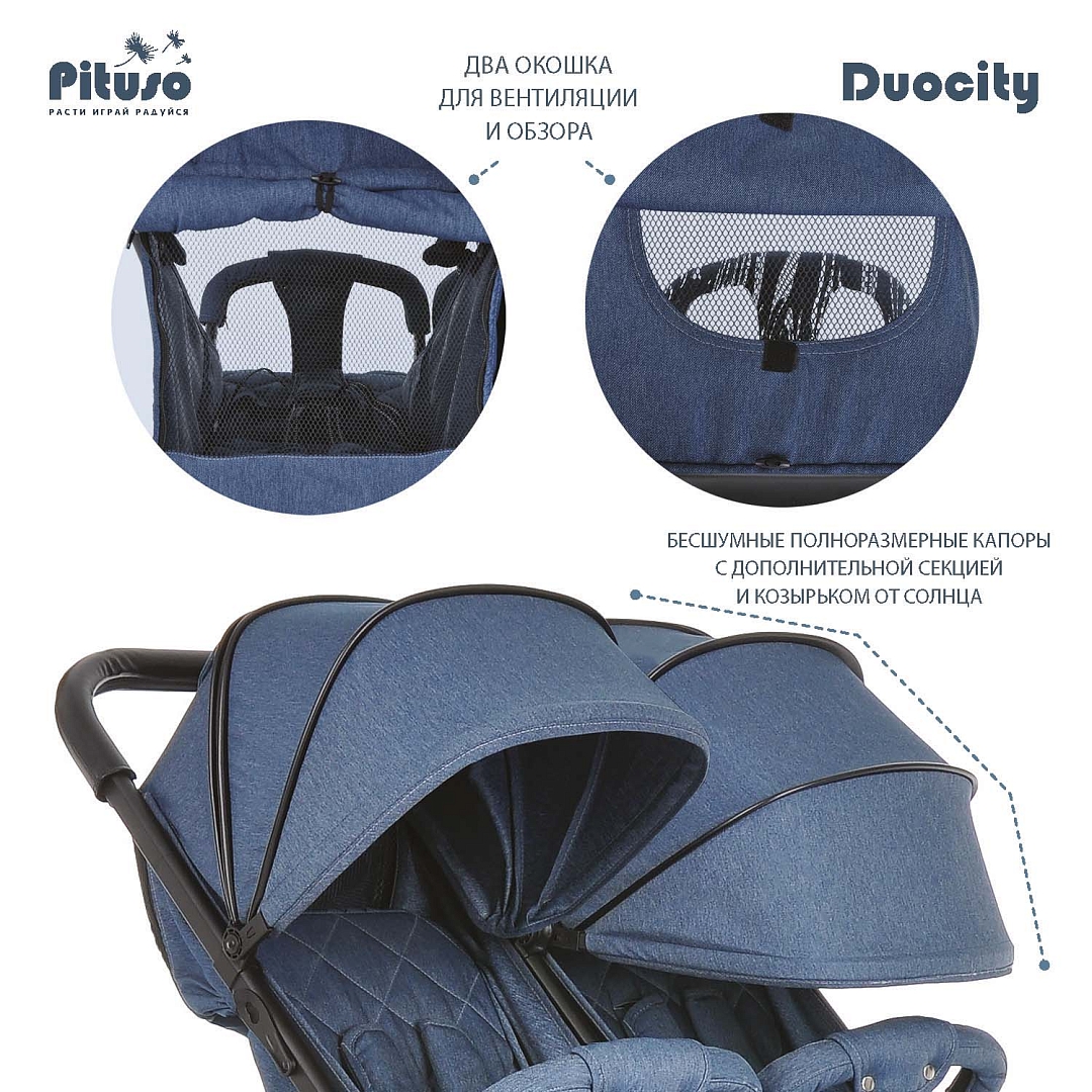 Коляска для двойни PITUSO DUOCITY PU 2021 (Питусо дуосити ева) - это новое поколение прогулочных колясок комфортных для малышей и удобных для родителей. На раме размещено 2 сидения с индивидуальными системами регулировок: подножки, капюшона и спинки. Демисезонную коляску можно использовать круглый год благодаря утепленному чехлу для ножек, колесам на подшипниках, а также удлиненному капюшону, который опускается низко до самого бампера. Модель выполнена из ветрозащитной ткани. В DUOCITY просторные мягкие сидения шириной 32 см, глубиной 21 см, высота спинки 40 см. Длина спального места составляет 78 см. Спинки регулируются по высоте в любом положении, независимо друг от друга. Удлиненный капюшон из трех частей со скрытой секцией на молнии. Капюшон дополнен козырьком на молнии. Задняя стенка капюшона полностью открывается для вентиляции, дополнена карманом для мелочей на молнии.