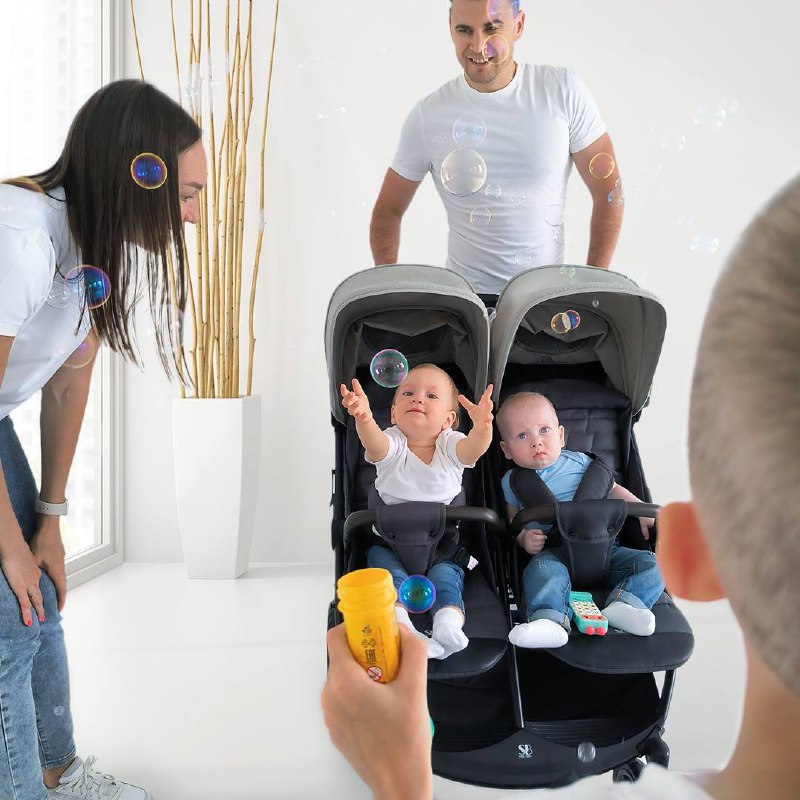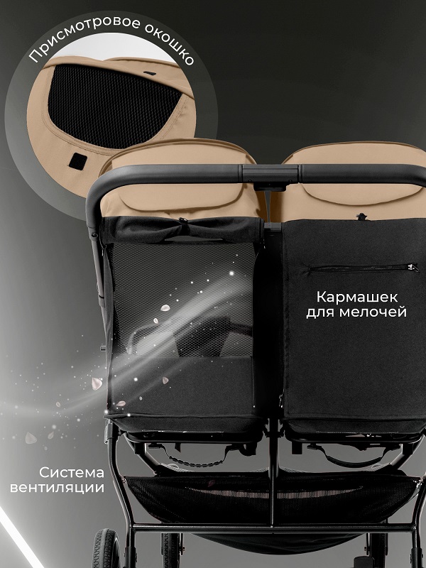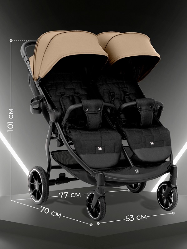 - Рама коляски оснащена двумя сиденьями с индивидуальными системами регулировки, что обеспечивает максимальный комфорт во время поездок с двумя малышами.