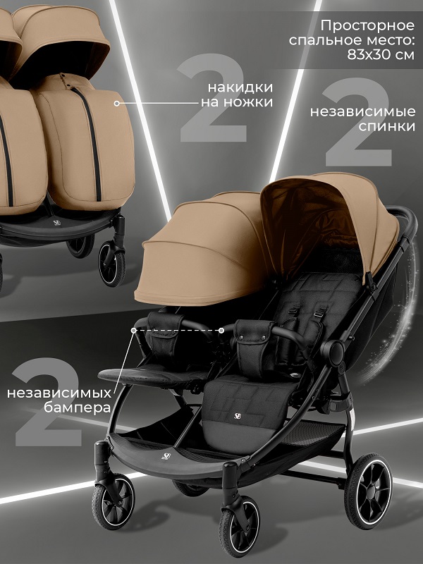 Прогулочная коляска для двойни Sweet Baby Donna 2025 (Свит беби Донна) - стильная и современная коляска для двойни или погодок с легким весом и компактными размерами. На раме размещено два отдельно регулируемых сидения. У каждого малыша будет свое просторное место с полностью опускающейся спинкой, регулируемой подножкой, большим капюшон, а так же системой безопасности: 5 ти точечные ремни, бампер и паховый ремешок от сползания. Дети не будут мешать друг другу во время прогулки и пока один малыш может комфортно спать в коляске, второй может удобно сидеть и наблюдать за окружающим миром. Коляска относиться к демисезонной, так как имеет утепленные накидки на ножки и большой капюшон, который может укрыть детей до бампера. Сам капюшон многосекционный, с дополнительной секцией расширения на молнии. Есть удобное смотровое окошко для наблюдения за ребенком. Коляска оснащена практичными резиновыми колесами (мягкий каучук) с протекторами. Такие колеса не сдуваются, не сложны в эксплуатации и ваша коляска всегда будет готова к прогулке. У коляски будет мягкий ход, который не потревожит ваших малышей. Ширина колесной базы всего 77 см, что позволит проехать в стандартный дверной проем.