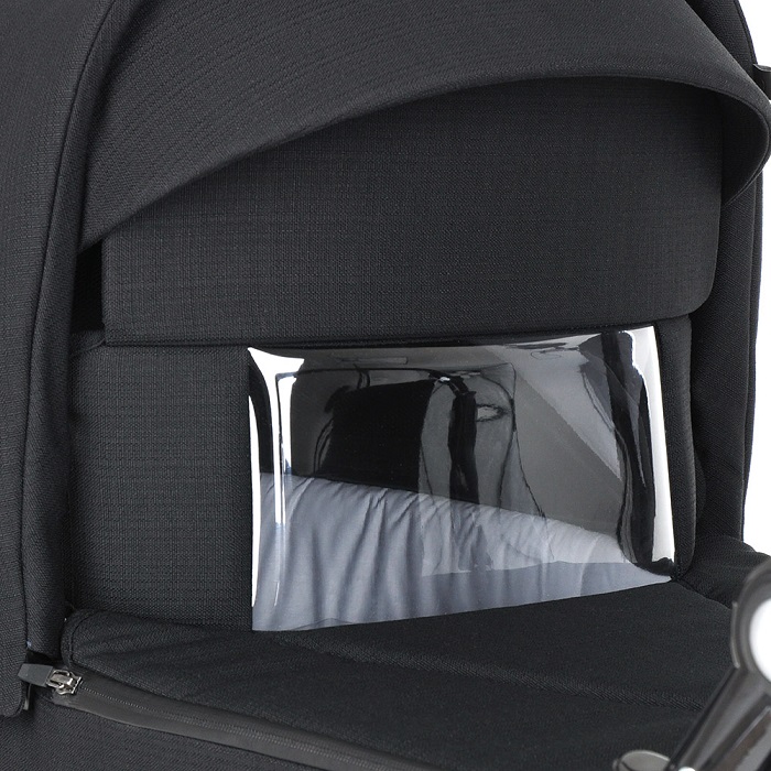 - Капор имеет жёсткое крепление к люльке, на нём находится ручка для переноски люльки, в раскрытом положении он фиксируется, для сложения необходимо нажать кнопки с двух сторон. В капор встроена антимоскитная сетка и дополнительный козырёк для защиты от солнца и дождя.