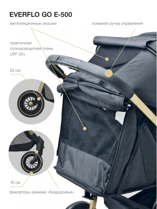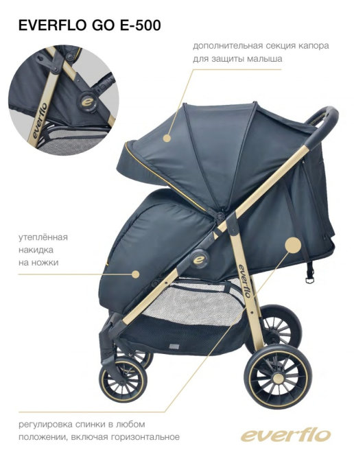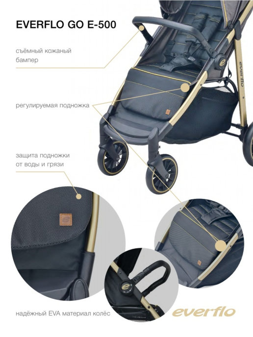 Коляска Everflo Go E-500 (Еверфло Гоу е-500) - качественная и надежная прогулочная коляска для ребенка от 6 месяцев. Коляска Everflo Go E-500 имеет стильный дизайн и надежную конструкцию, которая позволит использовать коляску максимально долго. При небольшом весе всего 8 кг коляска имеет комфортное спальное место 80х35 см. Благодаря многопозиционной регулировке родителям будет удобно найти оптимальный угол наклона спинки для своего ребенка. Подножка имеет несколько регулировок по высоте и выполнена из специального, легко моющегося материала. Бампер и ручка для родителей выполнены из качественной эко кожи, что очень приятно на ощупь и более практично и износостойко по сравнению с другими обивками.