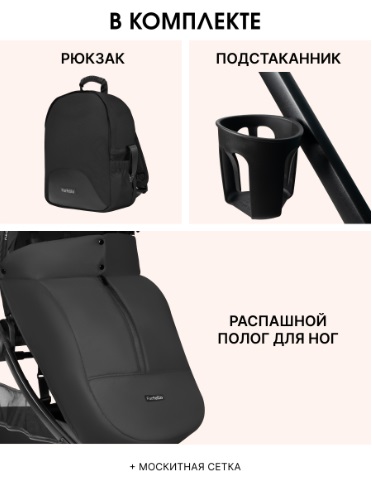 В комплекте: рюкзак, подстаканник, распашная накидка для ножек, каркасная москитная сетка.