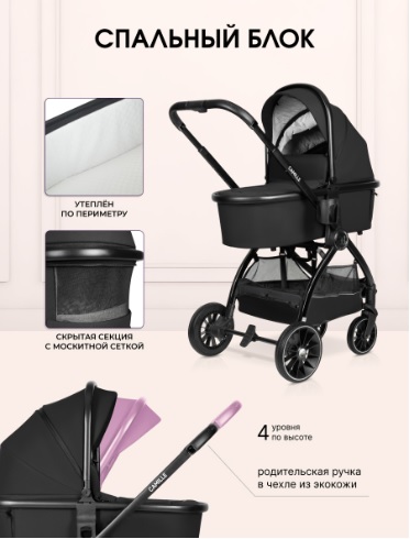 Коляска состоит из двух съемных модулей и большой комплектации, в том числе стильный рюкзачок и 3d москитная сетка.