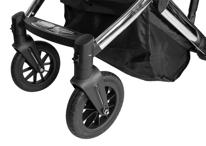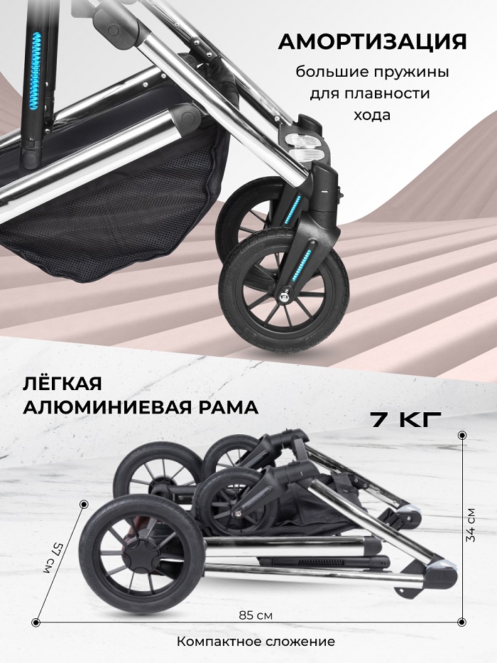 Рама коляски представлена на легкой, но прочной алюминиевой раме. Рама легко складывается книжкой и очень компактная для перевозки или хранения. Коляска оснащена практичными резиновыми, не сдуваемыми колесами. Они просты в обслуживании, и всегда готовы к прогулкам. Пружинная амортизация сглаживает все неровности дороги, защищая ребенка от тряски. Родительская ручка с покрытием из качественной эко кожи выдвигается и легко настраивается под рост родителей.