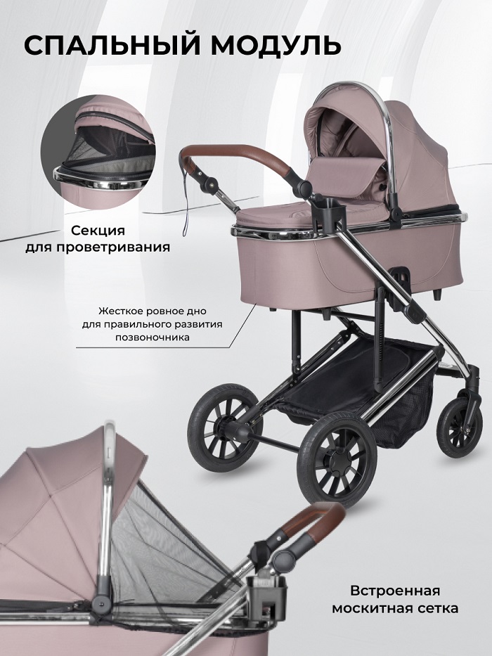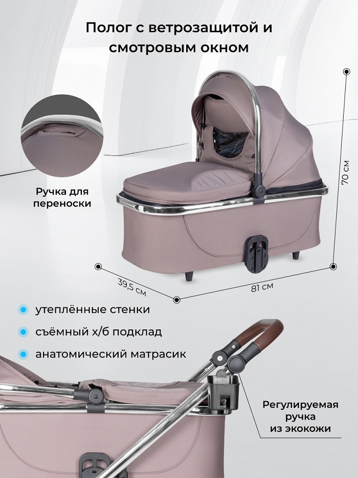 Для новорожденного ребенка предусмотрена очень комфортная люлька в качественном текстиле. Люлечка имеет стандартные размеры 73*30 см (по матрасику), которые позволят спокойно катать ребенка в ней до 6-8 месяцев. Внутри для малыша предусмотрены теплые мягкие борта на синтепоне, жесткое ровное дно для правильного развития позвоночника, анатомический матрасик. Внутренний чехол выполнен из качественного х/б и легко снимается для стирки, вы сможете стирать люльку так часто как вы посчитаете нужным. На капюшоне предусмотрена вентиляционная секция, которая надежно фиксируется на молнию, гарантируя тепло в зимний период времени. Встроенная москитная сетка поможет от пыли, пуха, насекомых, листьев и всегда будет доступна к использованию. Если ребенок уснул, а уже пора домой, не страшно. На капюшоне предусмотрена удобная ручка для переноски люльки. Аккуратно сняли люльку с шасси и занесли со спящим ребенком домой. Благодаря специальным ножкам на дне люльки, она не испачкается и может использоваться как временная кроватка, например, в гостях, в поликлинике, на даче.