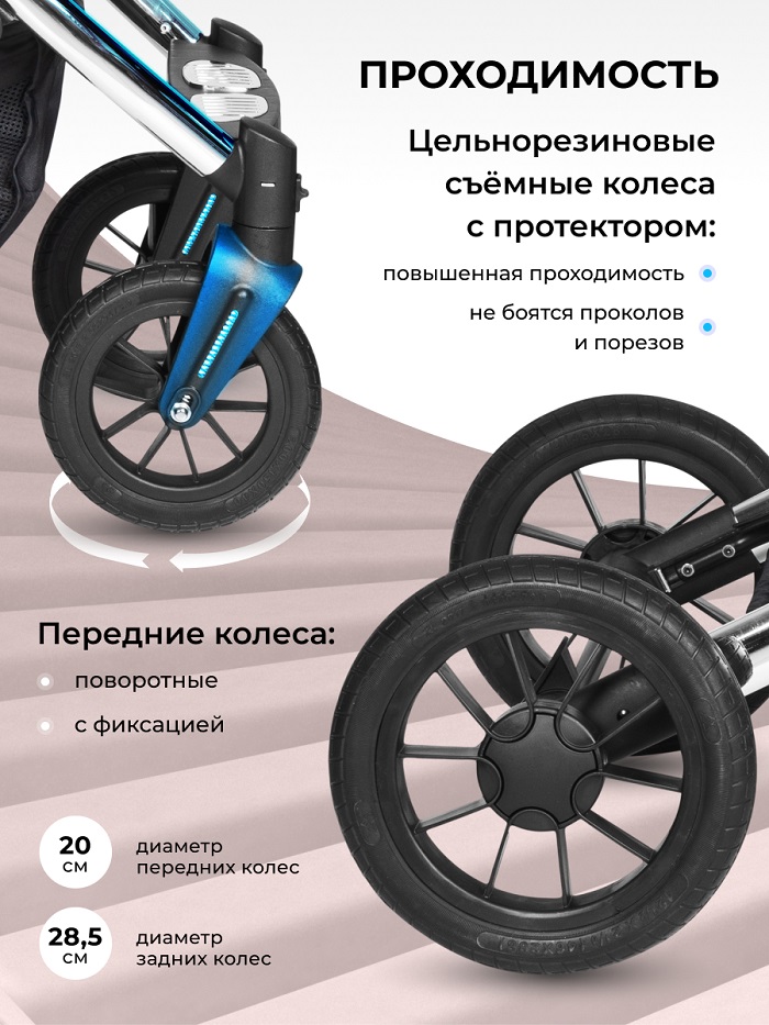 - Диаметр колёс: передние –20 см; задние –28,5 см.
