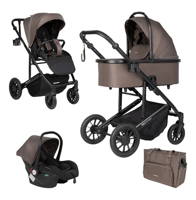 Коляска Farfello Sola Trio Comfort 3 в 1 (Фарфелло сола трио комфорт) - стильная и удобная коляска с очень большой компектацией. Это универсальная коляска с тремя съемными модулями: люлька для новорожденного, автокресло для малыша до года, прогулочный блок для ребенка от 6 месяцев до 3 лет. Так же с коляской идут руковички для прохладной погоды!, стильный рюкзачок для мамы, дождевик и подстаканник. А как же москитная сетка спросите вы? А она уже встроена в капюшон. Вы сможете гулять с коляской, путешествовать, безопасно перевозить ребенка в машине и быть готовым к любой непогоде.