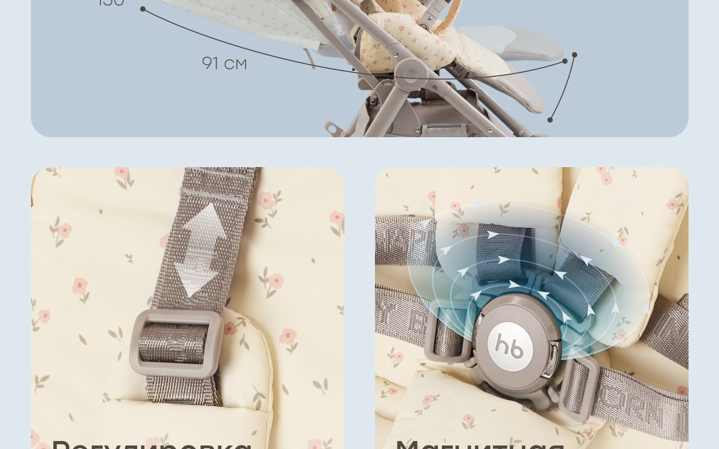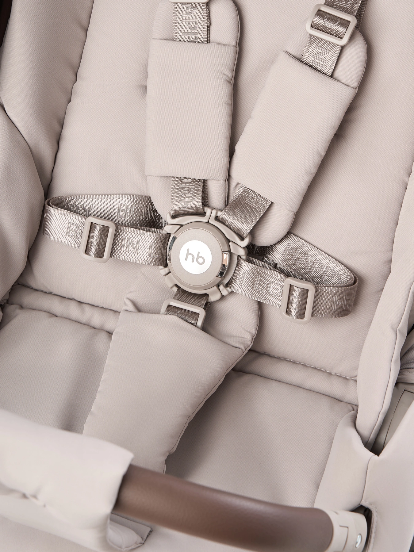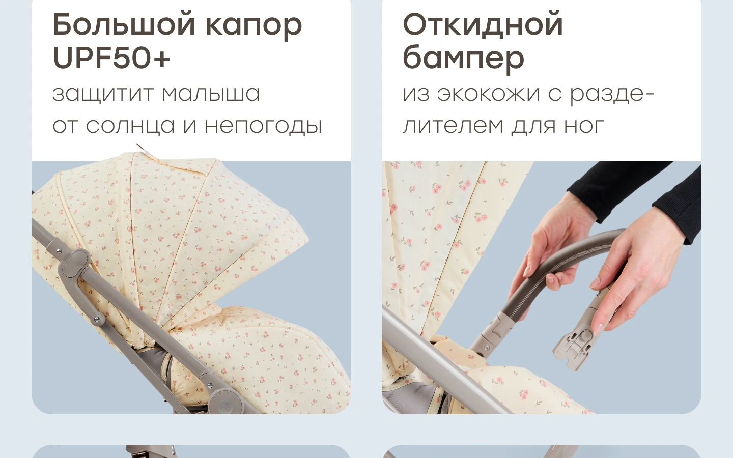 Для комфорта ребенка в коляске предусмотрено просторное спальное место с механической регулировкой спинки и подножки. Ребенок сможет полноценно спать в коляске во время длительной прогулки. За безопасность ребенка отвечают 5-ти точечные ремни безопасности с магнитным замком, который позволит быстро пристегнуть непоседу и отправиться на прогулку. Капюшон с расширением до бампера надежно укроет от любой непогоды, создаст атмосферу для сна и отдыха, создаст тень во время жаркого дня.