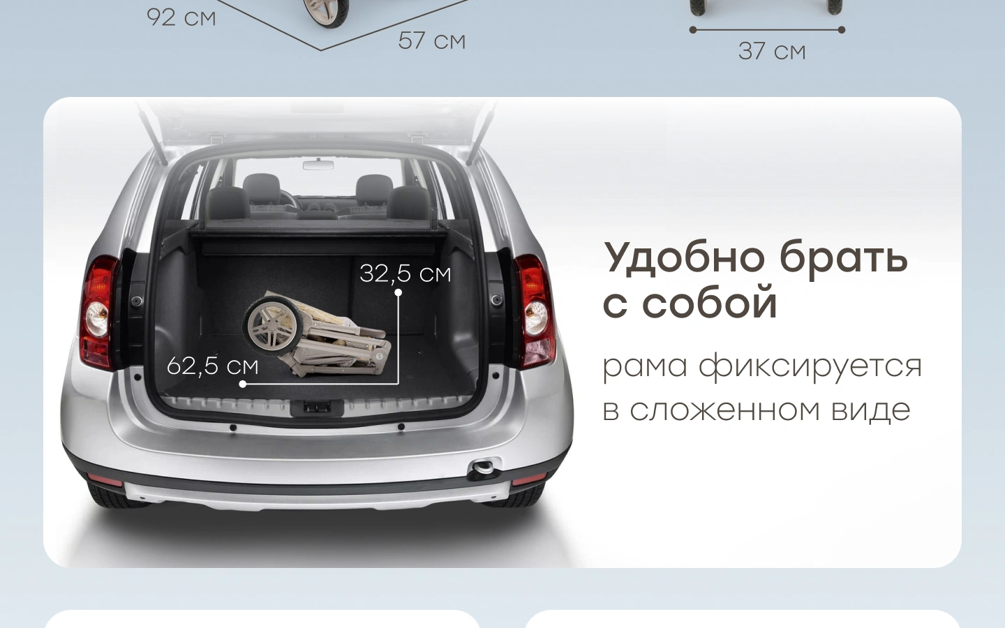 - Увеличенный диаметр задних колес для неровных поверхностей. Пластиковые, с резиновыми покрышками.