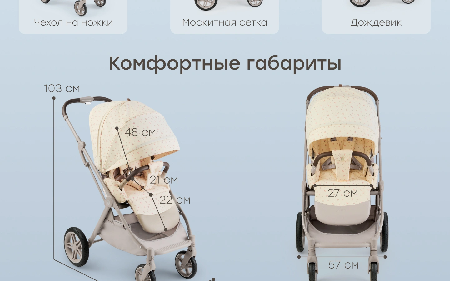 - В комплекте: дождевик, москитная сетка, накидка на ножки.