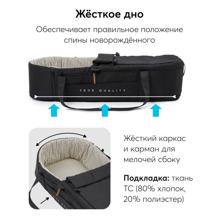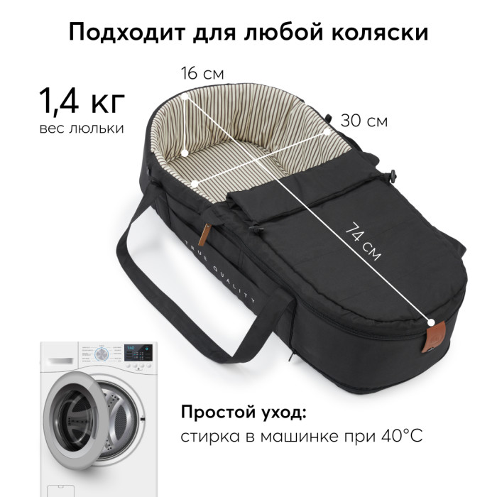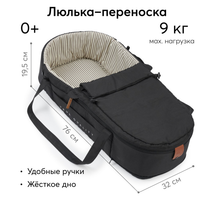 Качественная текстильная люлька имеет высокие утепленные борта и жесткое дно. Это полноценное спальное место для ребенка, при этом с удобными ручками для переноски. Вы сможете пользоваться такой "кроваткой" дома, в поликлинике, у друзей и родственников. В коляске люлька надежно крепится специальными ремнями, поэтому можно не бояться, что она сместиться во время прогулки. Для холодного времени года или для дополнительного комфорта люлька оснащена накидкой с удобным креплением на молнии.
